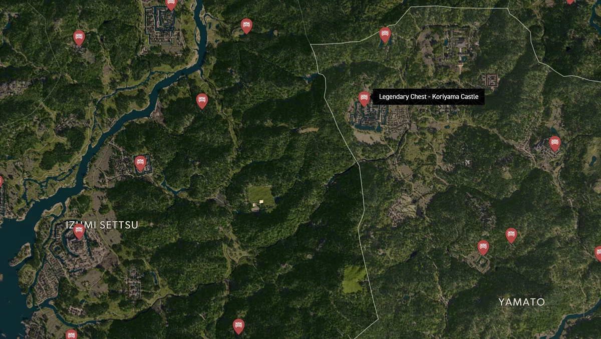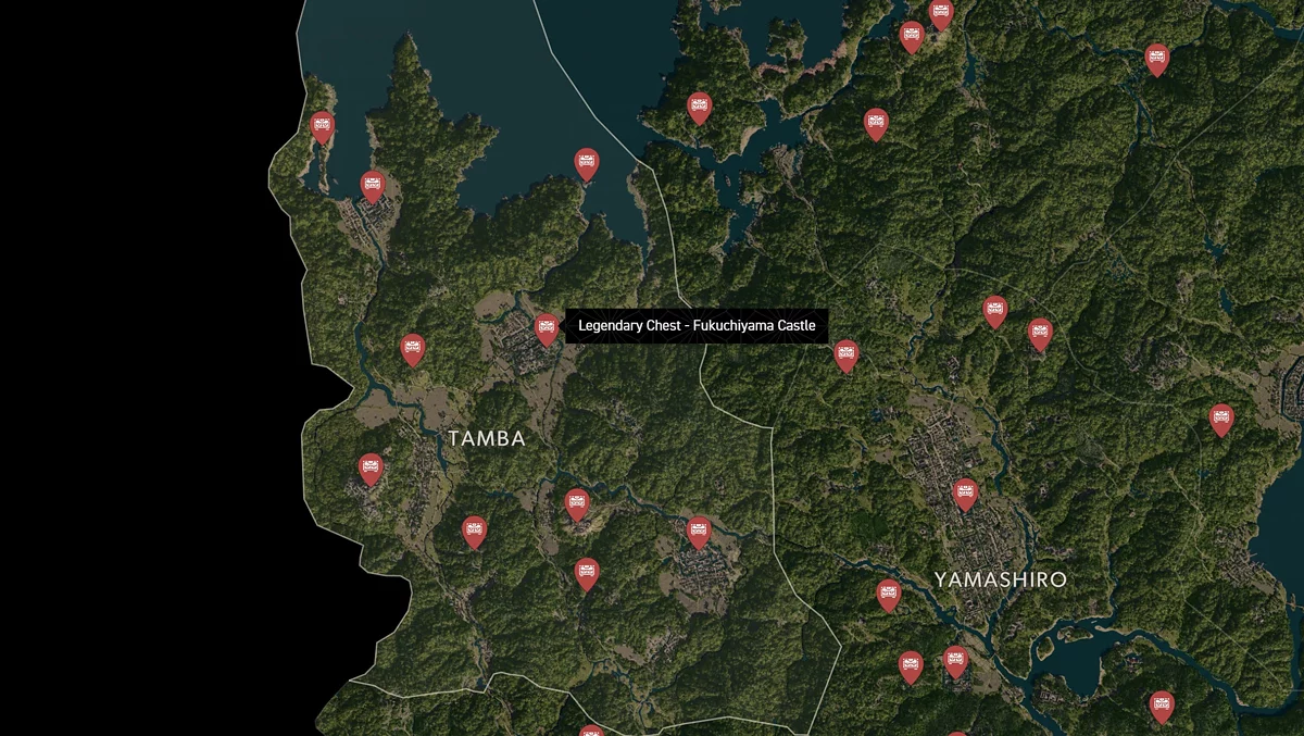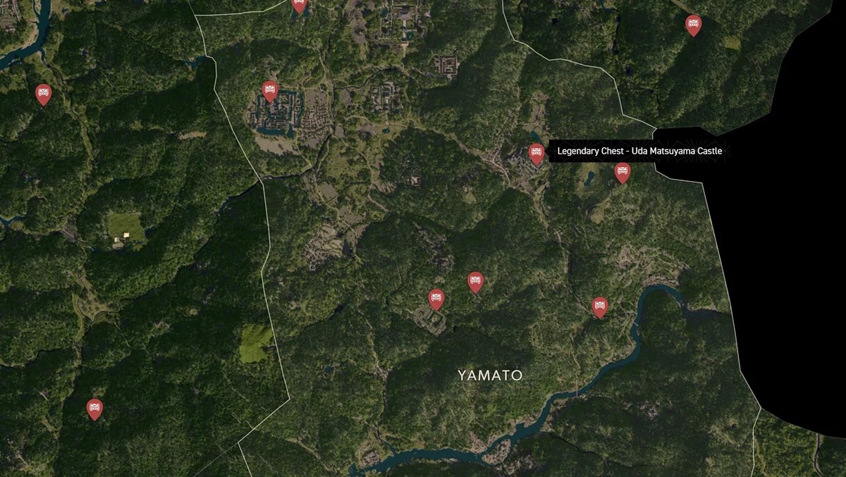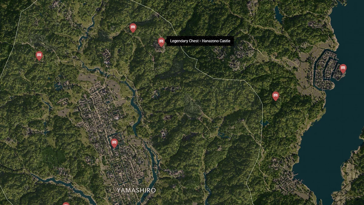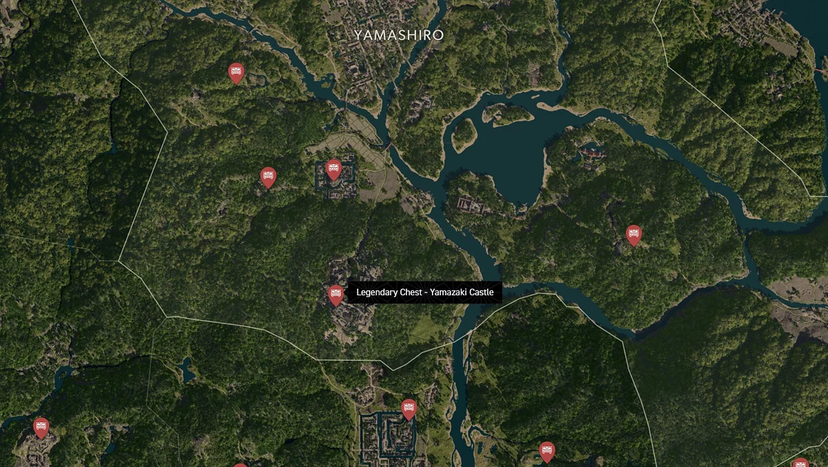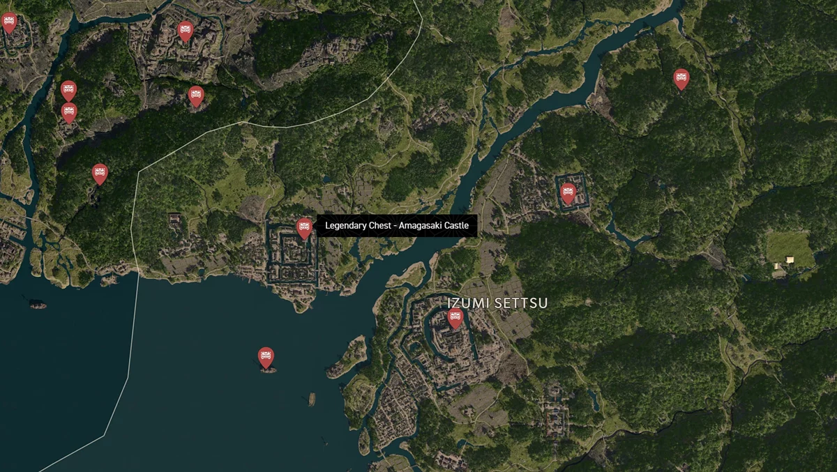 - Как найти: Крепость можно найти в центре округа. Чтобы открыть легендарный сундук, нужно победить двух самураев дайсё. Кейс можно найти в разрушенном здании на западной стороне территории замка.