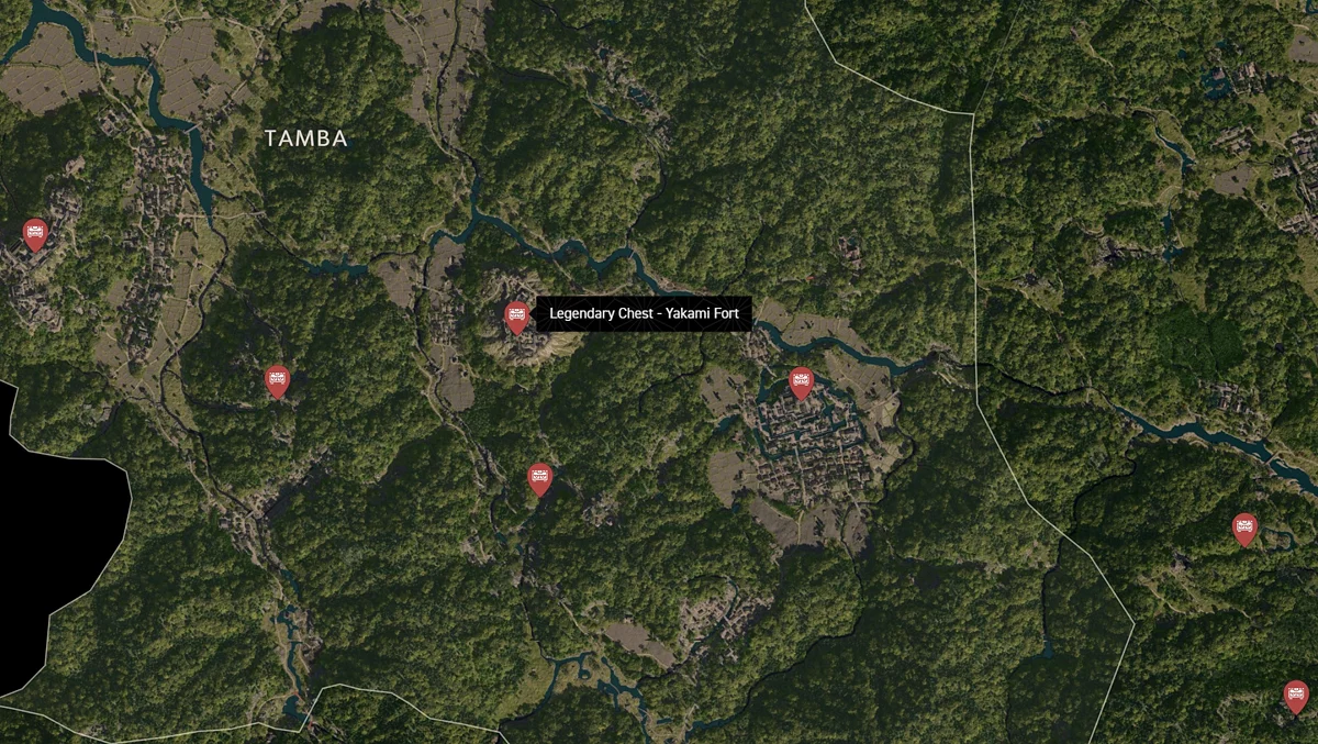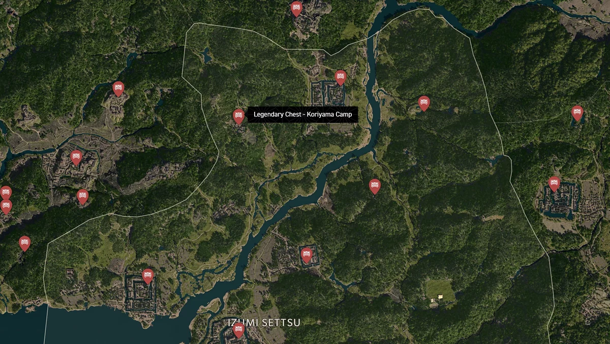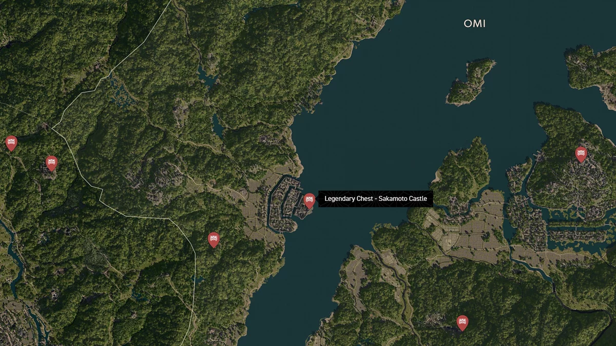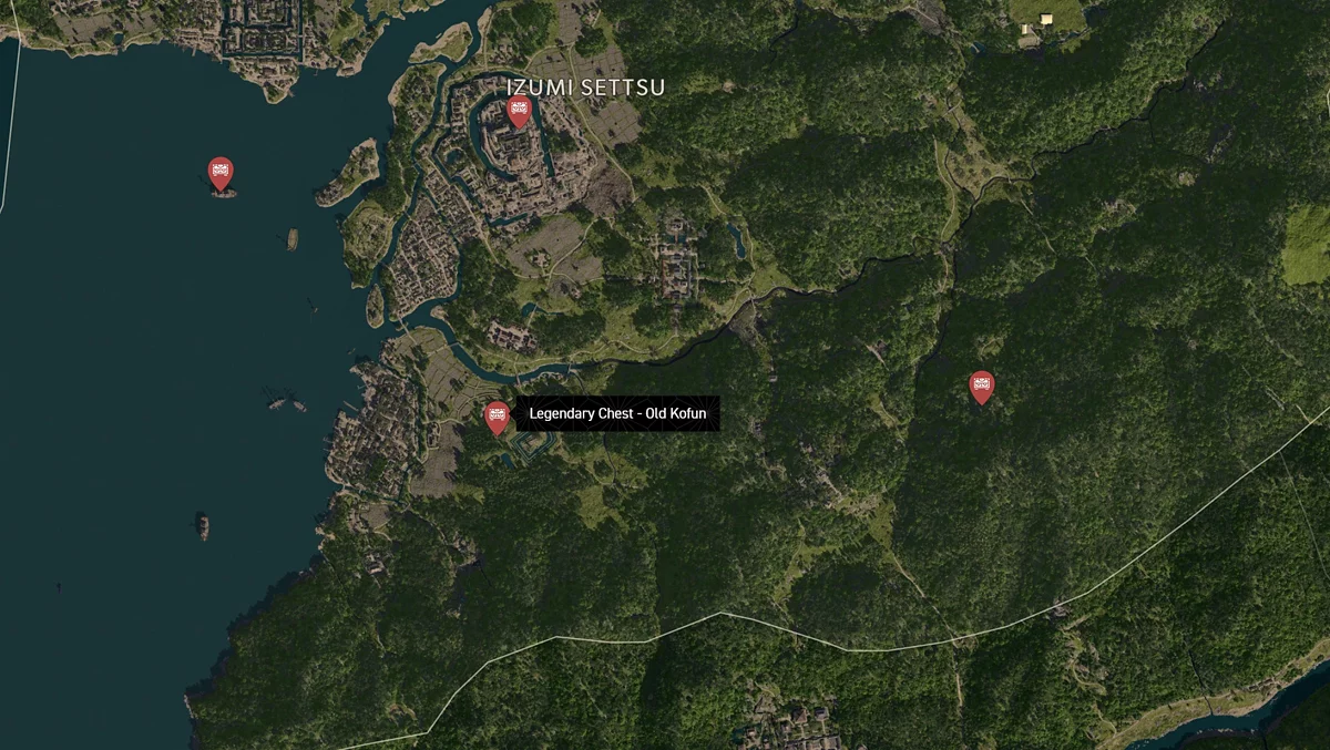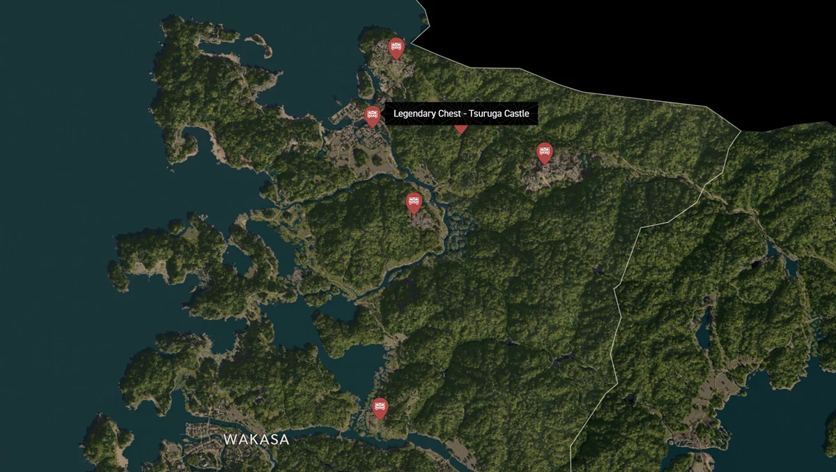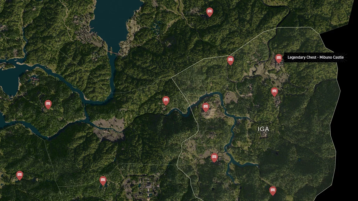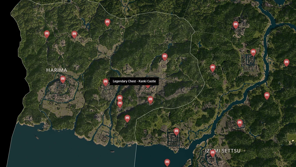 - Как найти: Крепость можно найти в центре округа. Чтобы открыть легендарный сундук, нужно победить двух самураев дайсё. Кейс можно найти в разрушенном здании на западной стороне территории замка.