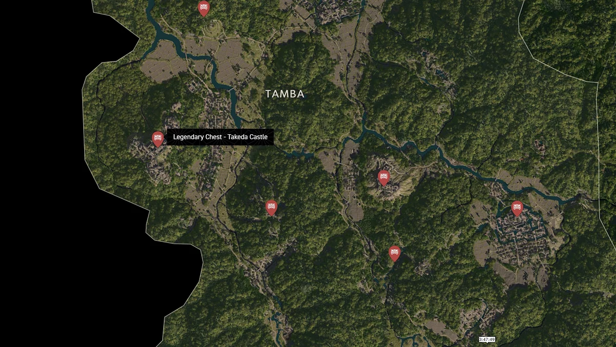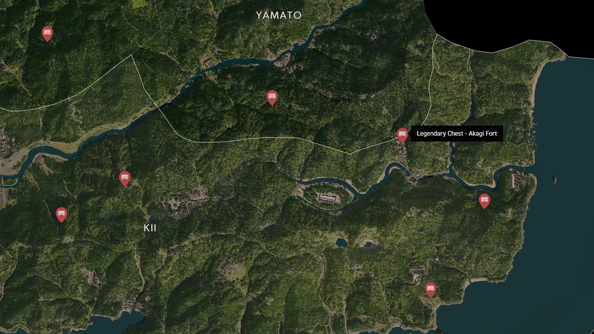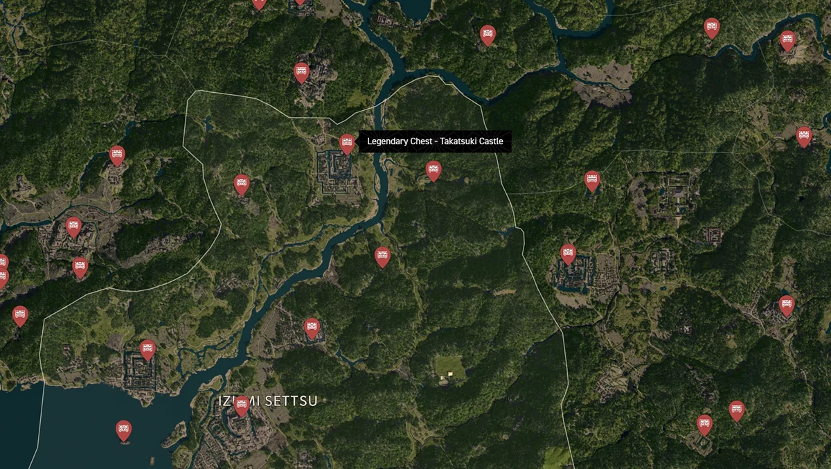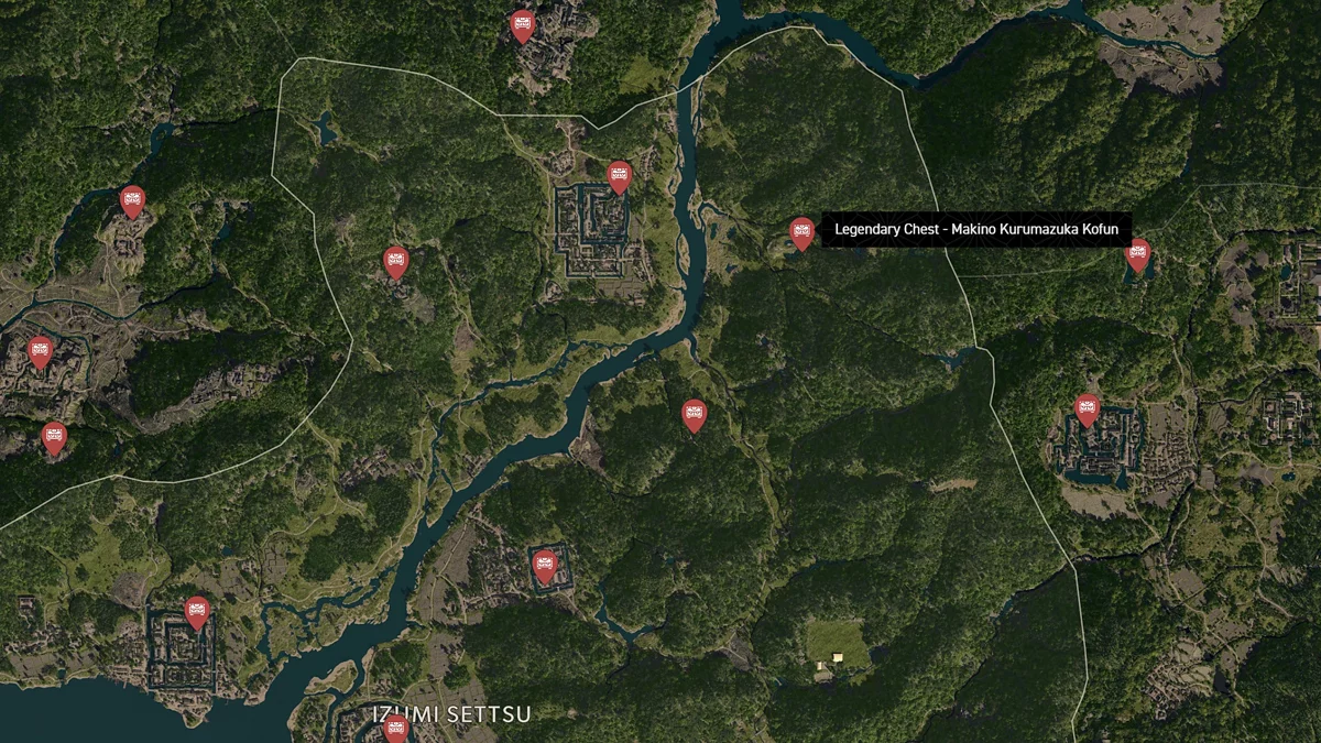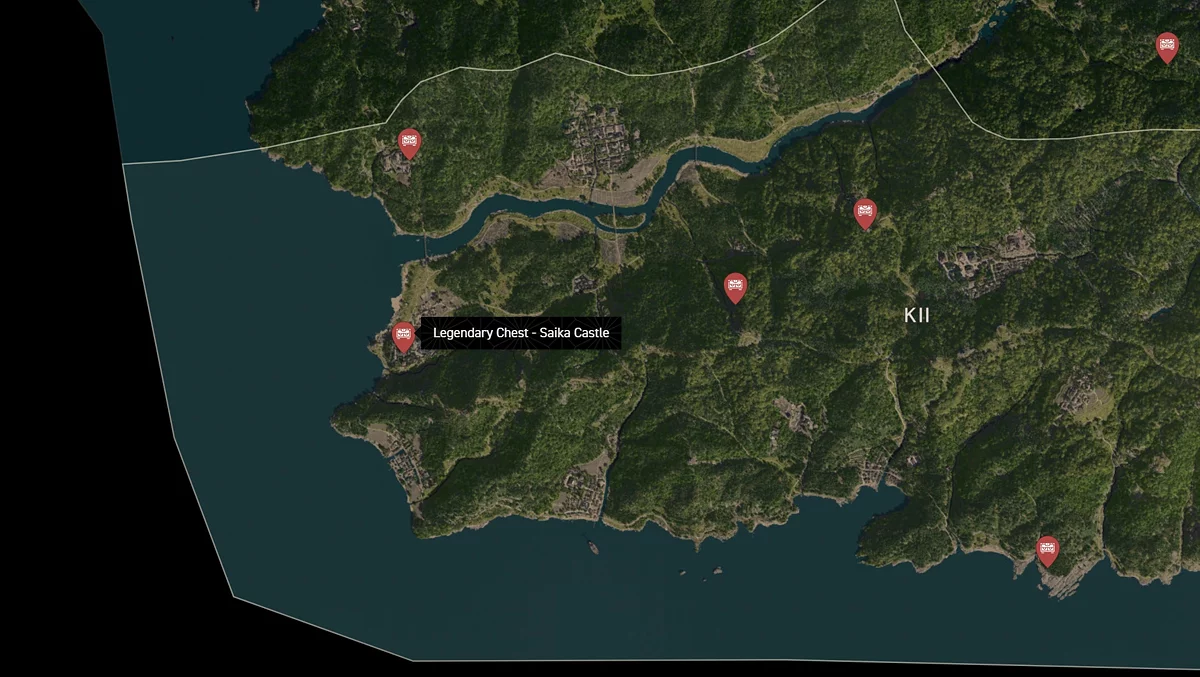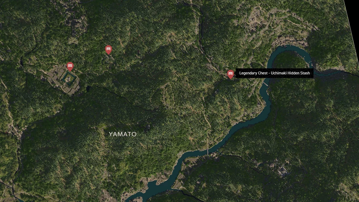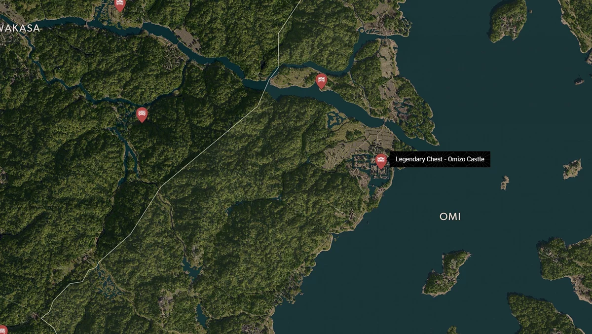 - Как найти: Крепость можно найти в центре округа. Чтобы открыть легендарный сундук, нужно победить двух самураев дайсё. Кейс можно найти в разрушенном здании на западной стороне территории замка.