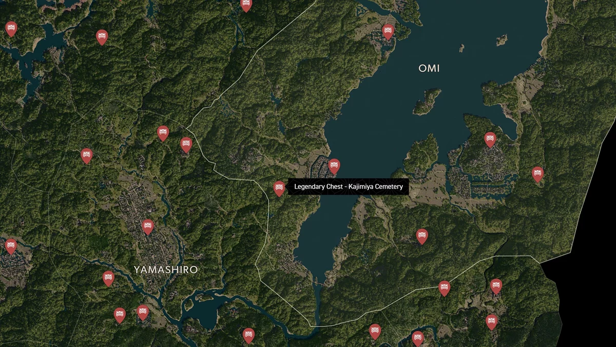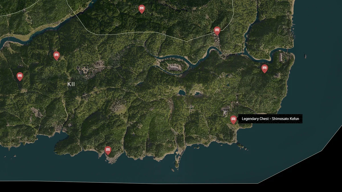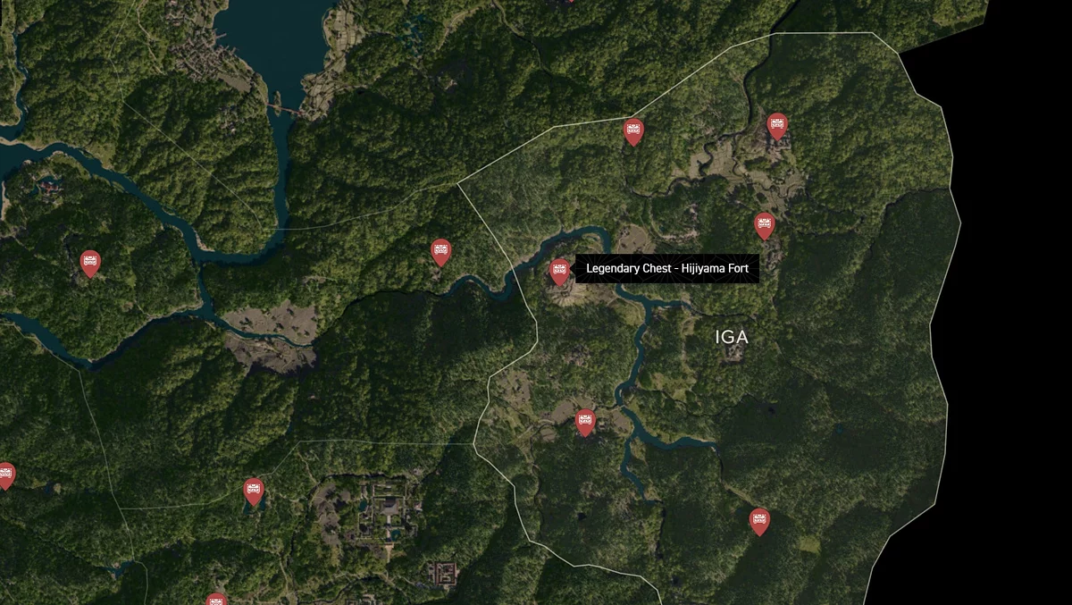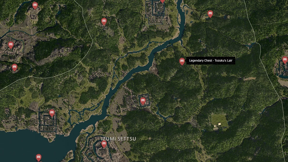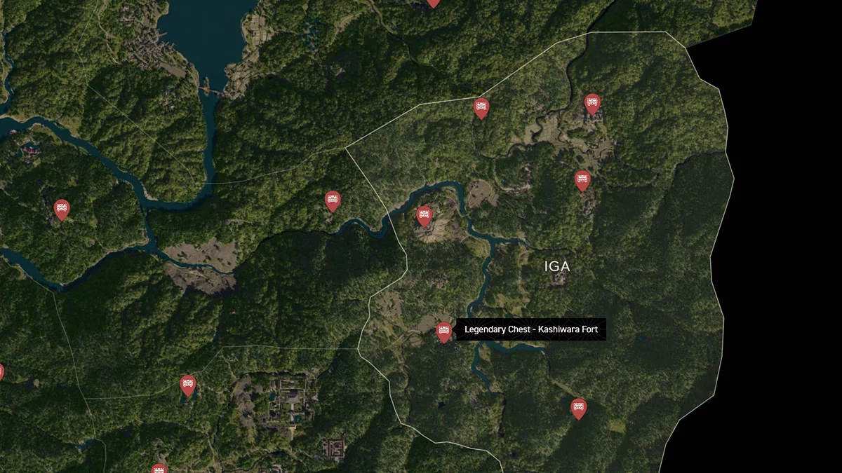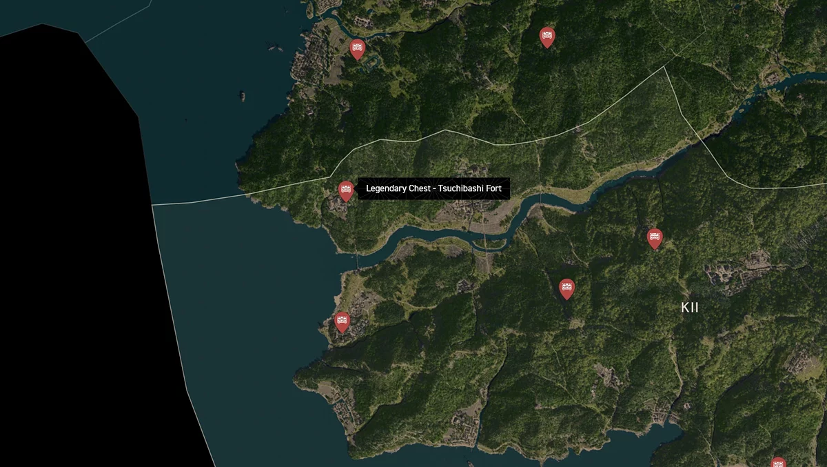 - Как найти: Крепость можно найти в центре округа. Чтобы открыть легендарный сундук, нужно победить двух самураев дайсё. Кейс можно найти в разрушенном здании на западной стороне территории замка.
