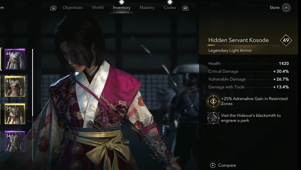 - Награда: Легкие доспехи — Легендарный костюм онна-муся (Legendary Onna-musha Kosode).