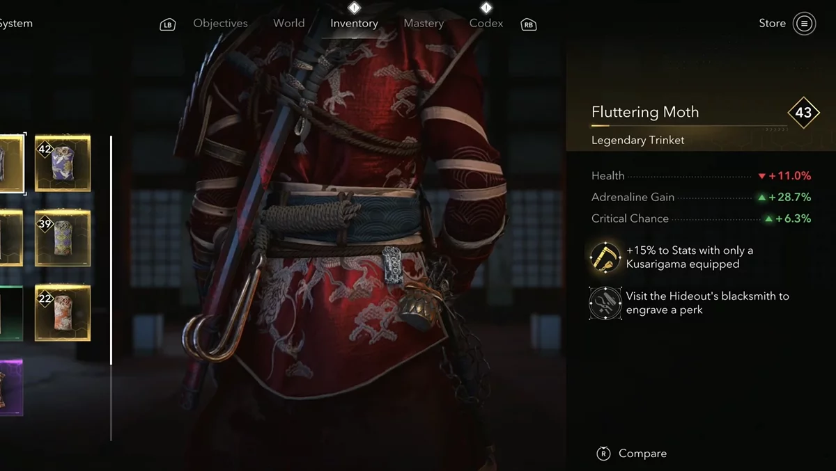 - Эффект: +15% к характеристикам, если экипирована только кусаригама.