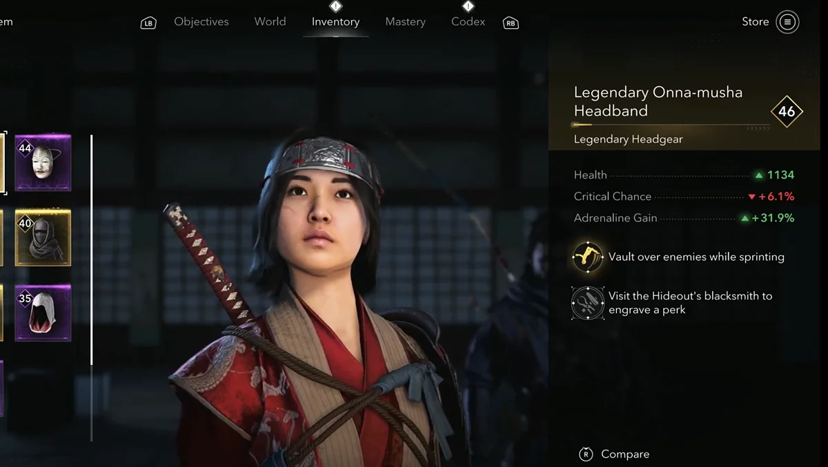 - Награда: Головной убор — Легендарная повязка онна-муся (Legendary Onna-musha Headband).