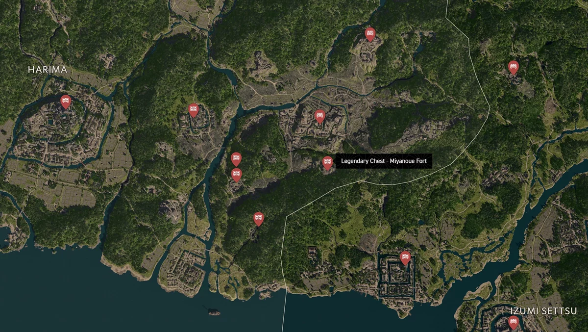 - Как найти: Укрепление можно найти в восточной части района. Победите четырех самураев, чтобы открыть легендарный сундук, расположенный в одном из домов на территории замка.