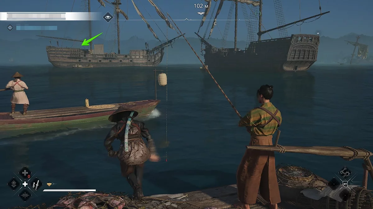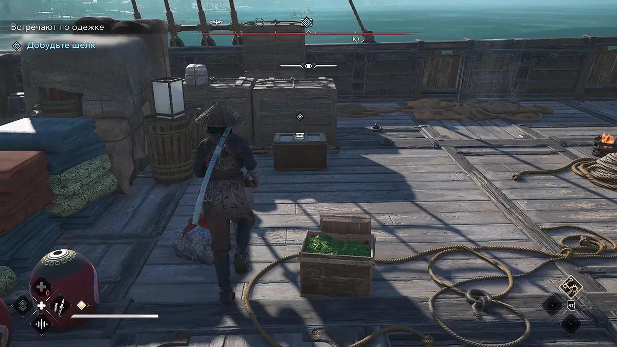 Обернувшись к морю, вы заметите два корабля вдали. На одном из них находится шёлк. Подплывите к первому судну и переберитесь по мачтам на второе. Решение о том, как действовать — устранять врагов или избегать их — остаётся за вами. Материал находится в одном из сундуков в центре палубы. Заберите шёлк и сделайте ещё один выбор.