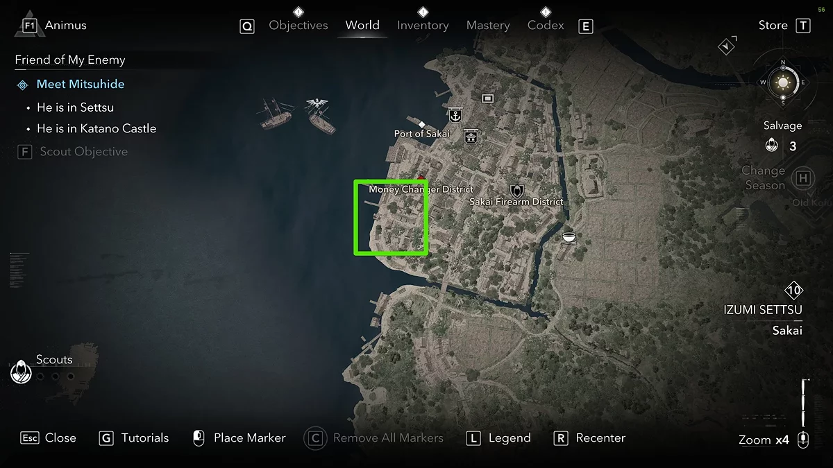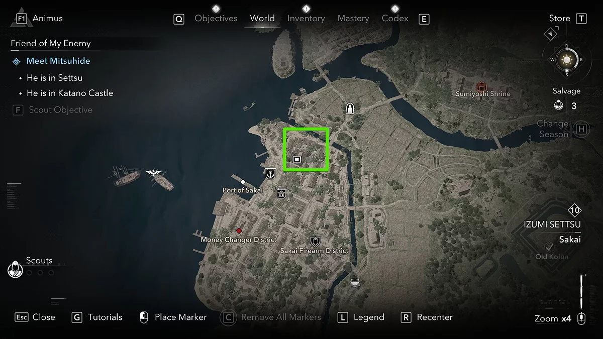 Получив квест «Встречают по одёжке», отправляйтесь в город Сакаи, расположенный на юго-востоке Изуми-сетцу. Добравшись до порта, следуйте вдоль лавок на юг, пока не встретите женщину в зелёном одеянии слева. Поговорите с ней, и задание обновится.