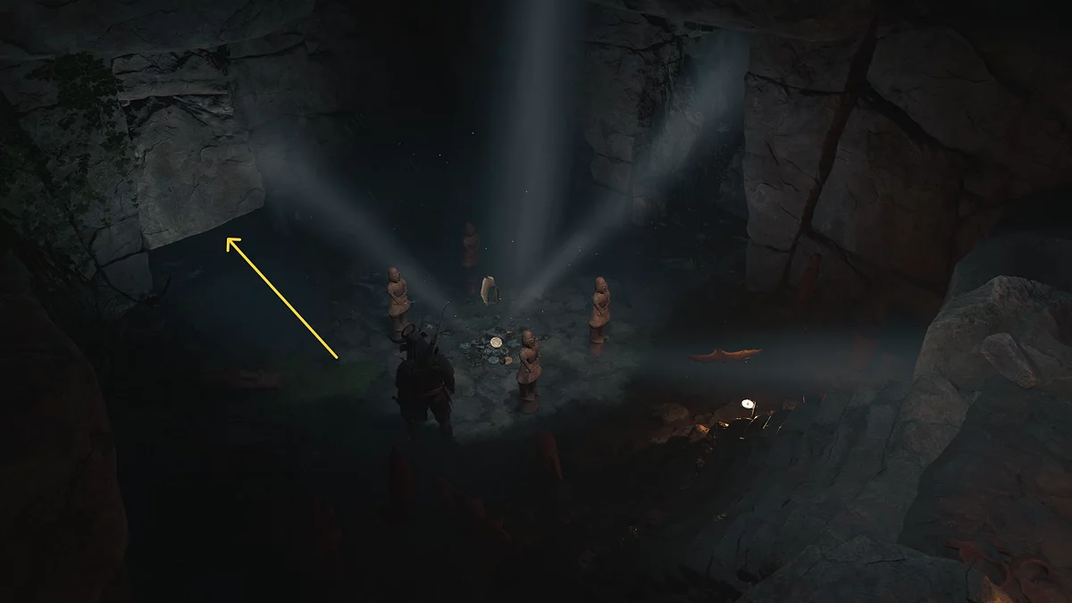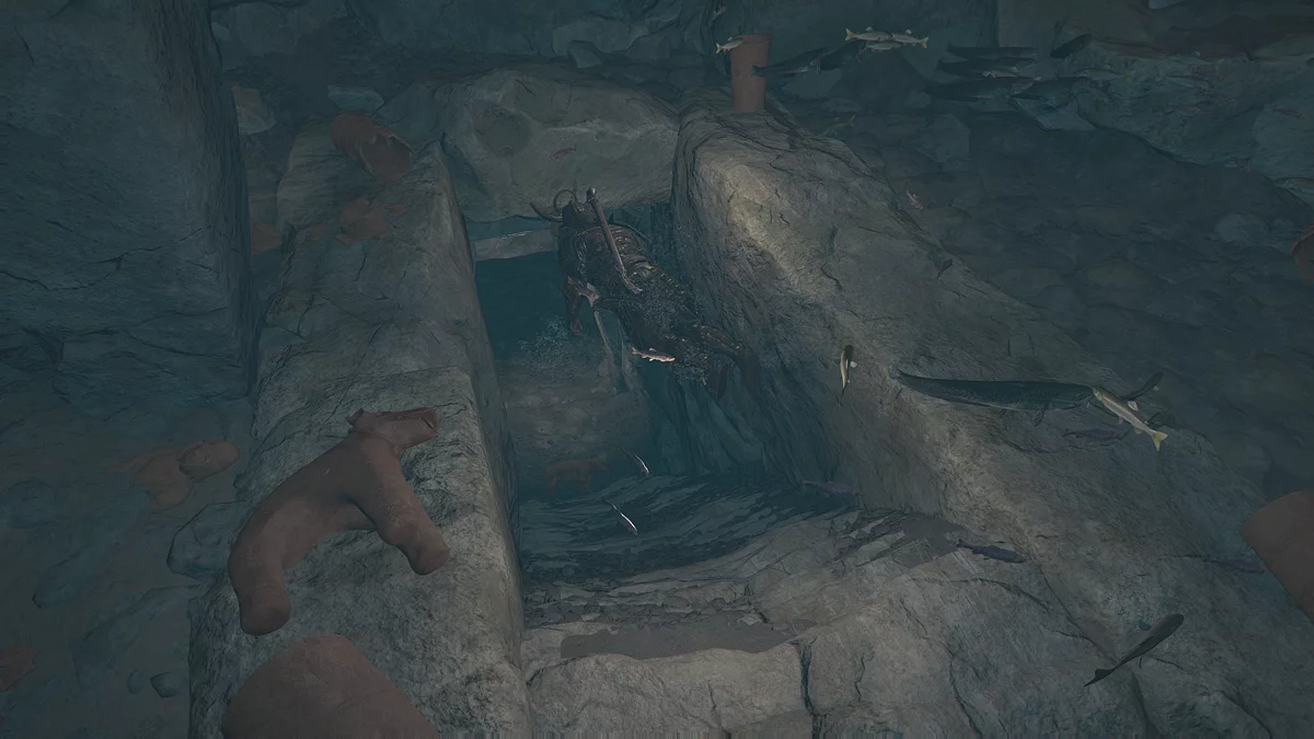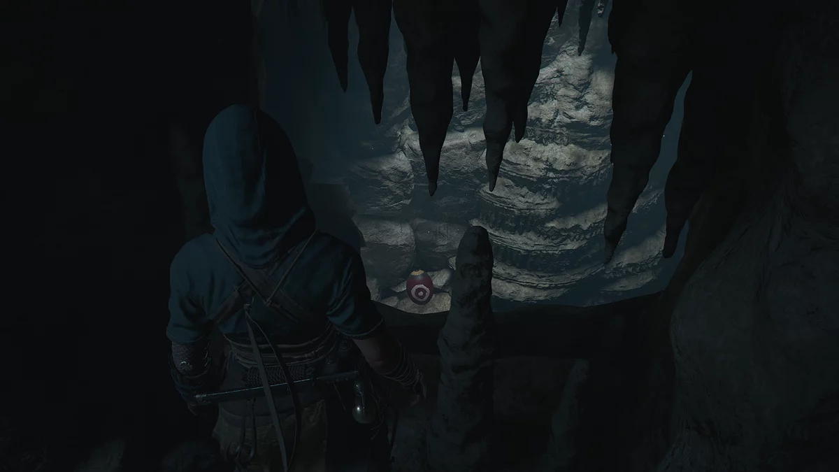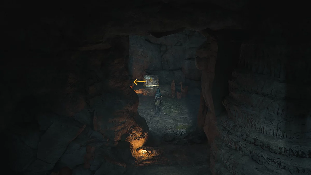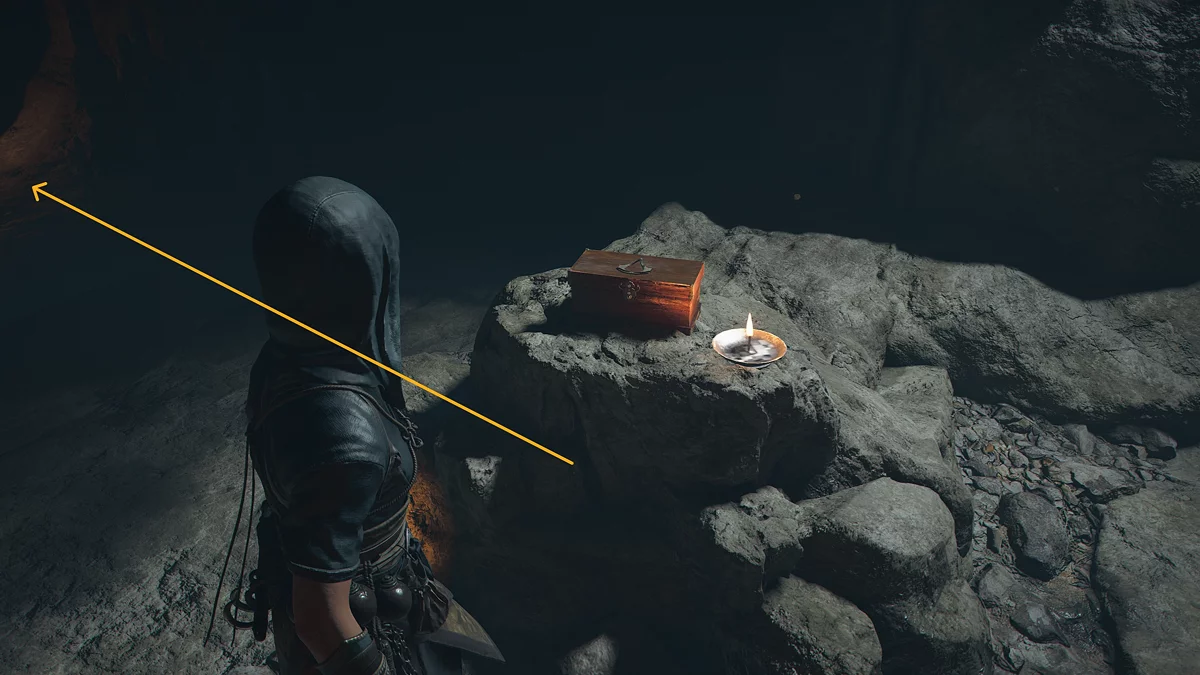 Перед вами откроется большая затопленная пещера. Сначала исследуйте правую часть, чтобы найти ларец, затем двигайтесь прямо через пещеру. Обнаружив шкатулку ассасинов, поверните налево и проследуйте к следующей расщелине.