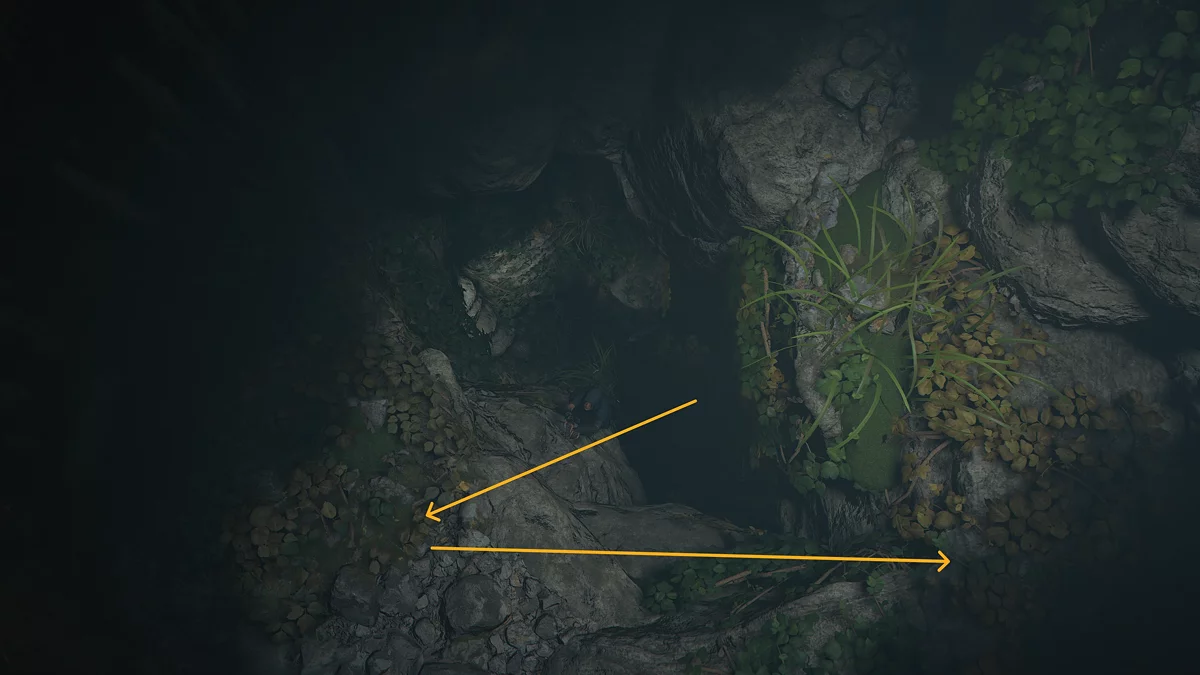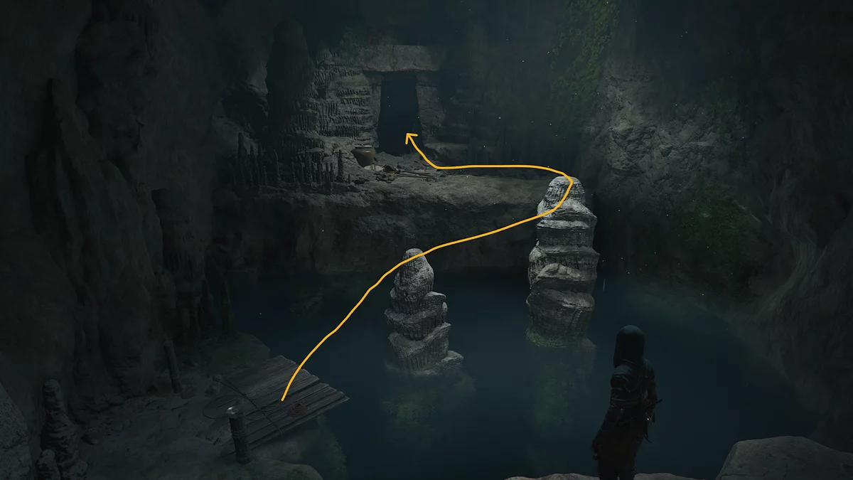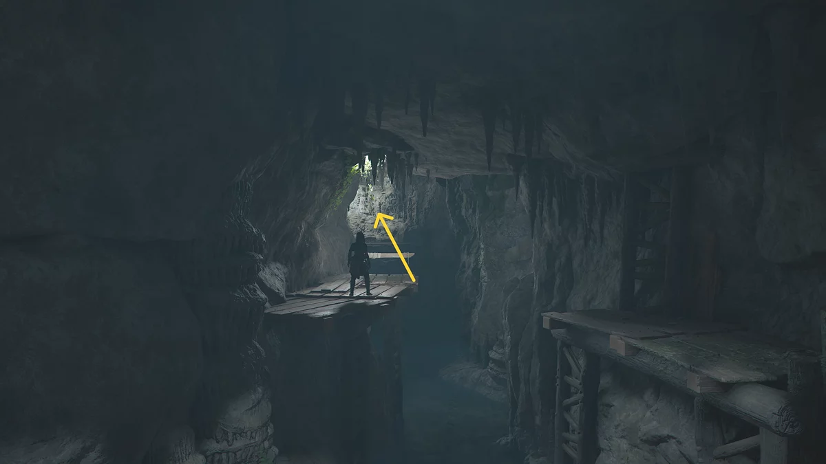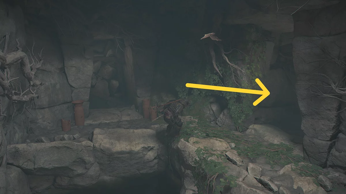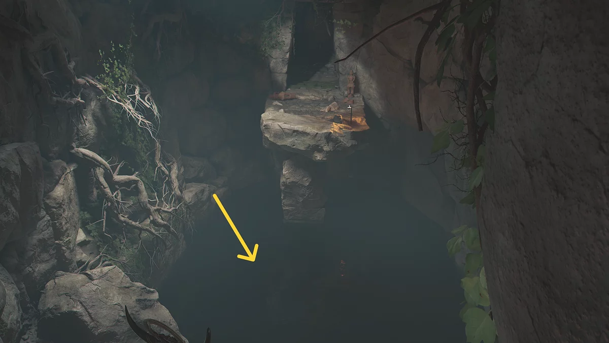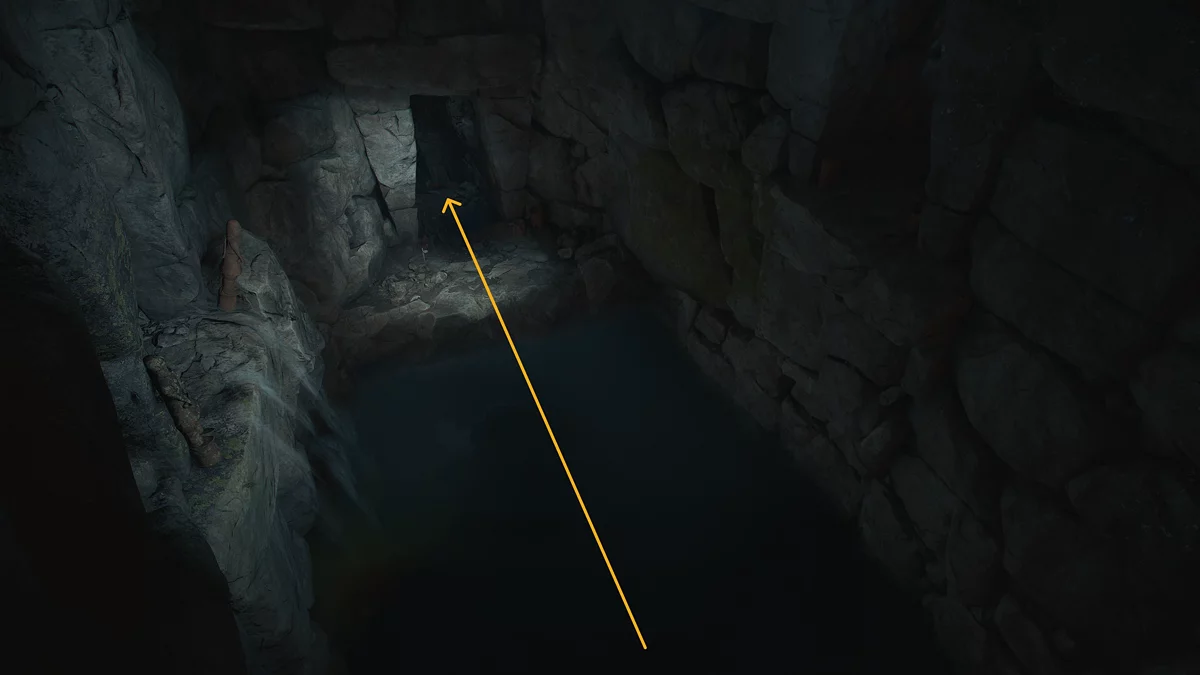 Начните спуск в подземелье. За каменным гробом найдите узкую расщелину и протиснитесь через неё. Продолжайте спускаться, затем спрыгните с деревянной балки в воду.