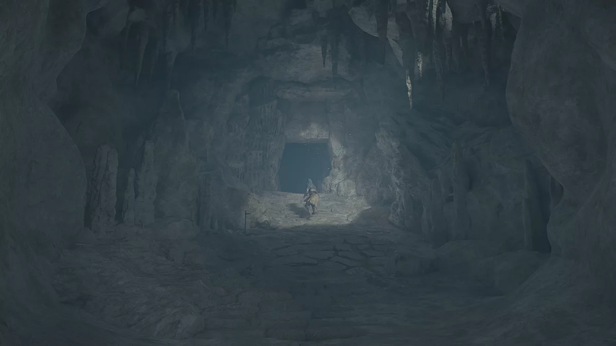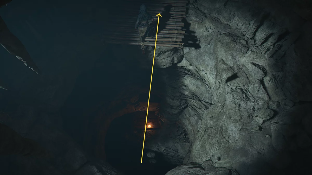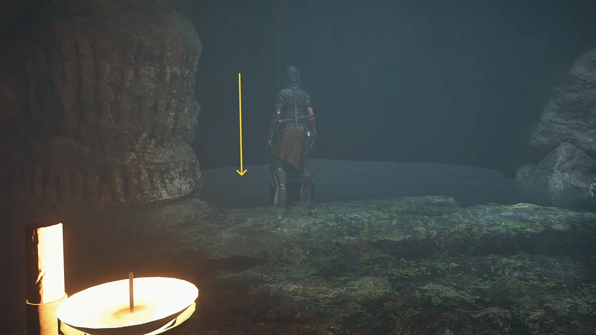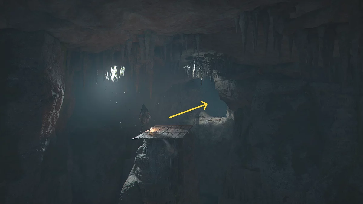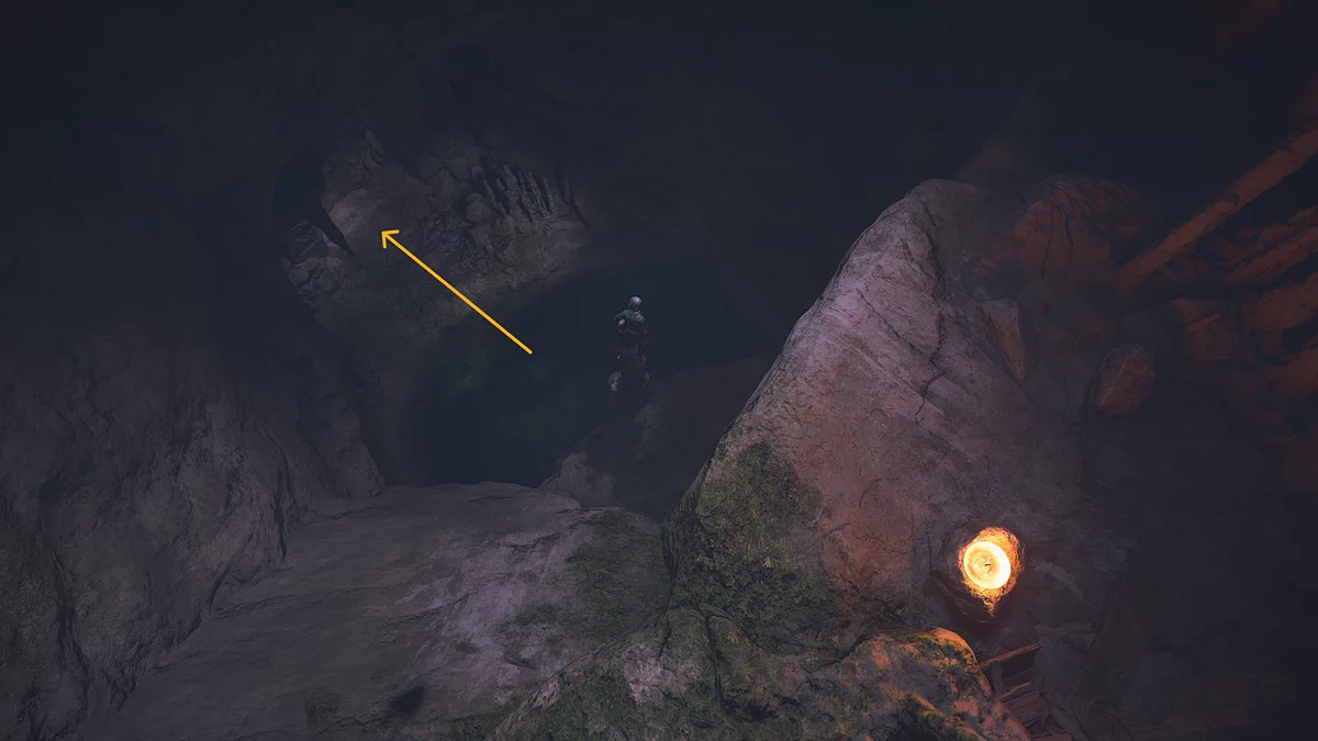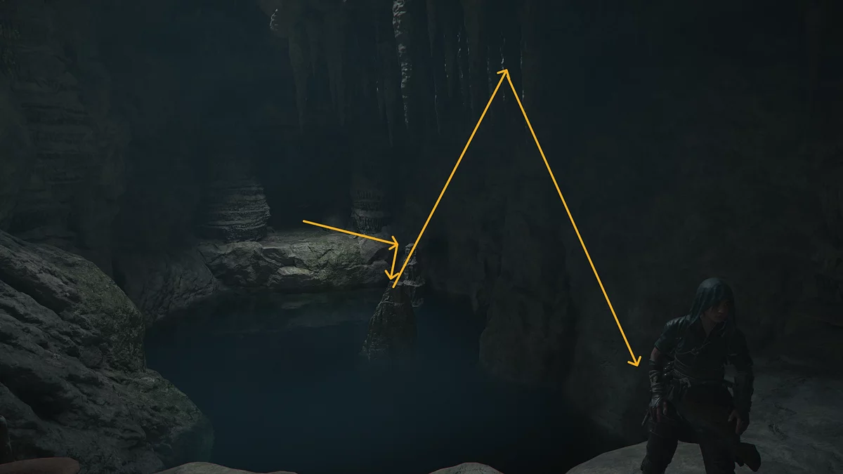 Начните спуск в подземелье. За каменным гробом найдите узкую расщелину и протиснитесь через неё. Продолжайте спускаться, затем спрыгните с деревянной балки в воду.
