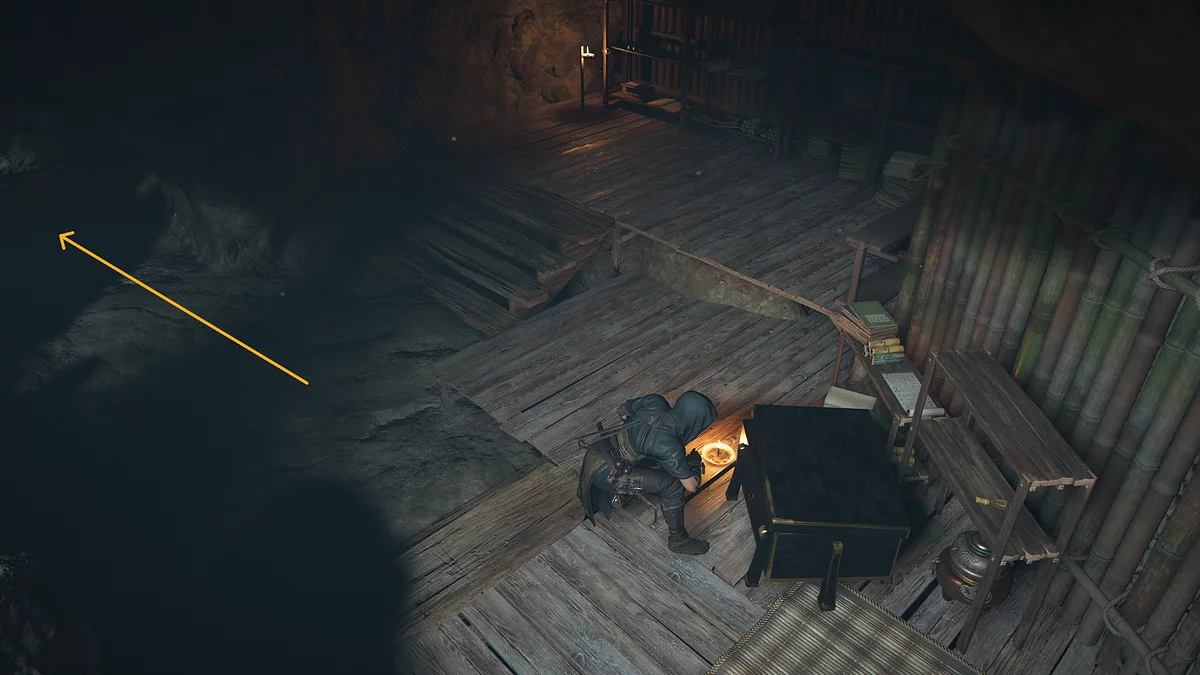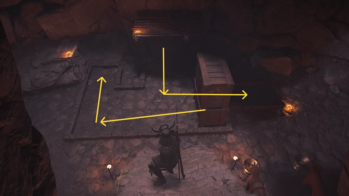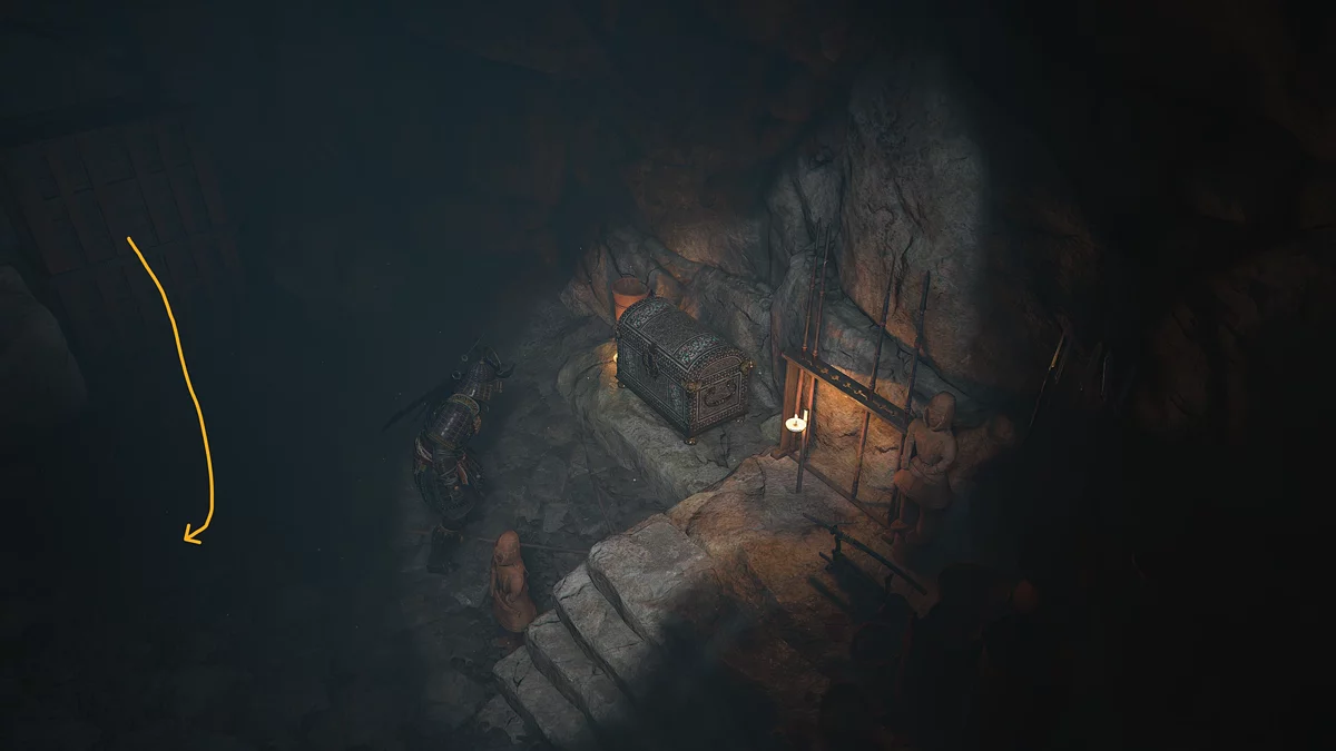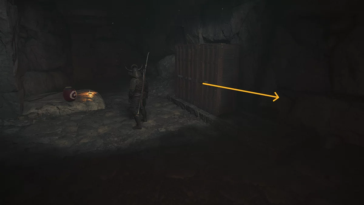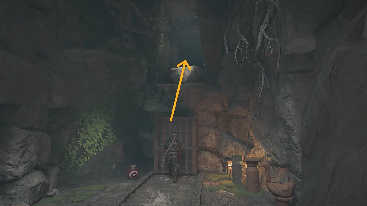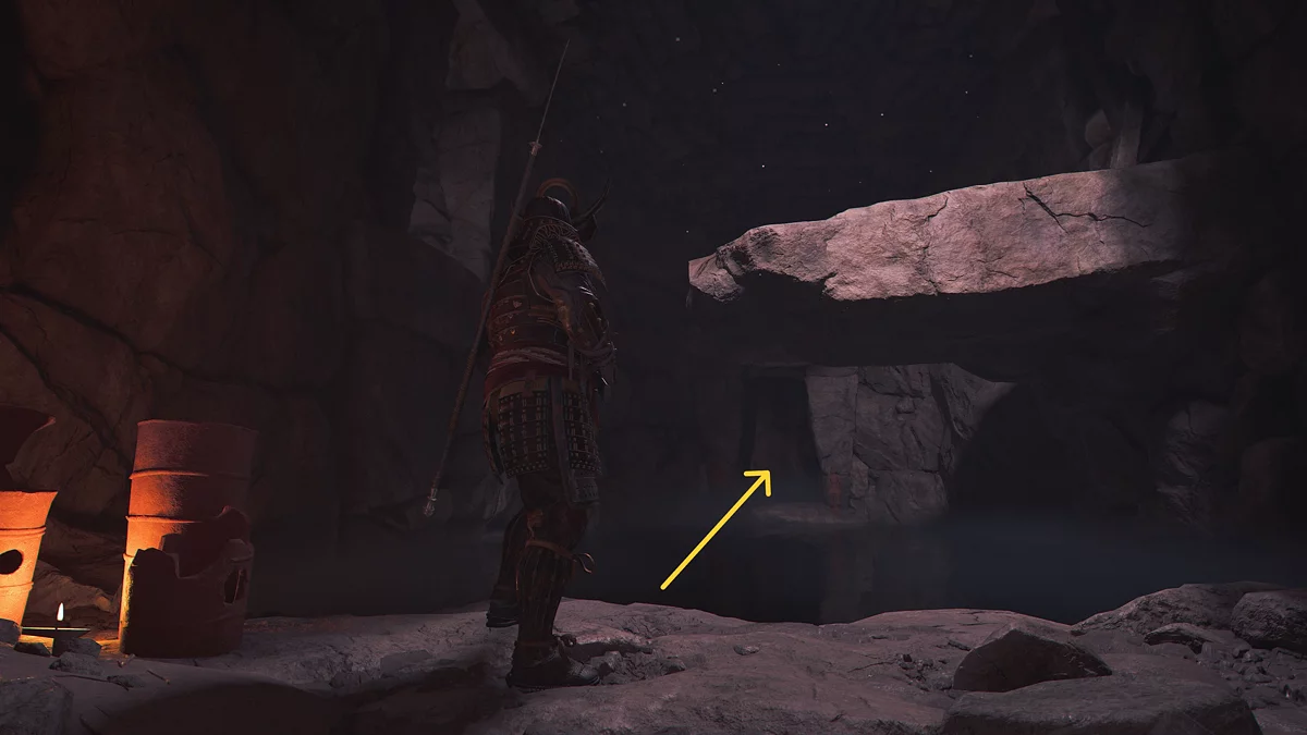 Возле спуска подберите глиняный сосуд с горючей смесью. Спуститесь вниз и используйте его, чтобы расчистить каменную преграду. Продолжайте движение, пока не достигнете зала с противниками. Здесь предстоит сразиться с тремя бойцами и одним тяжеловооружённым воином — обойти их незамеченным не получится. После победы разрушьте бамбуковую перегородку в левой части помещения. Проследуйте прямо, затем сверните вправо и спуститесь до первого ответвления налево, чтобы открыть сундук. Вернувшись, поднимитесь на уступ и проникните в следующую камеру, предварительно обыскав кейс слева.