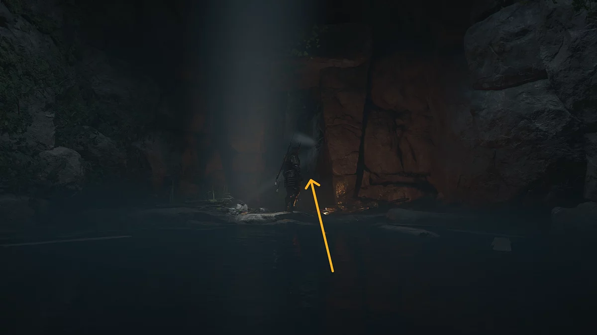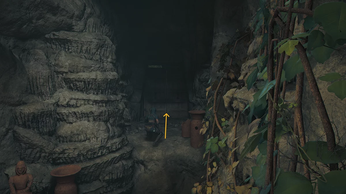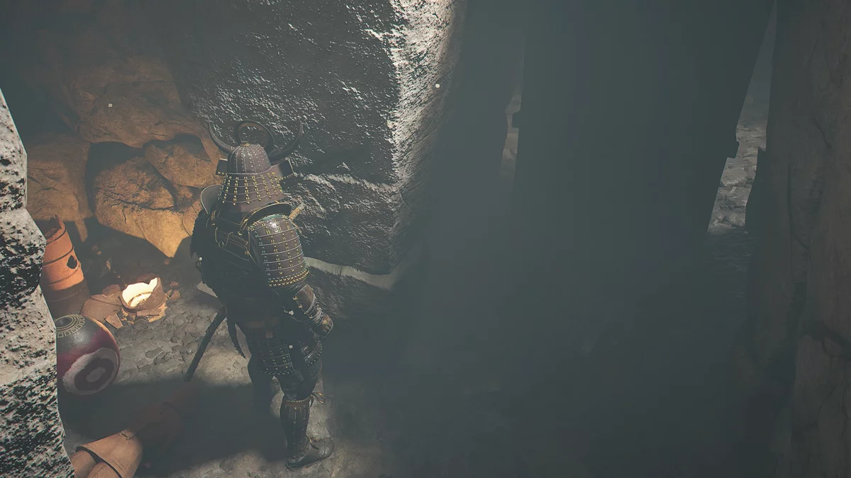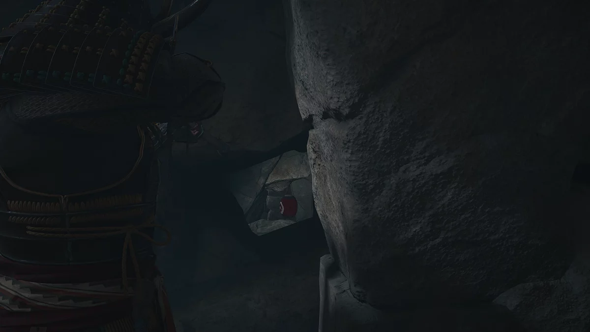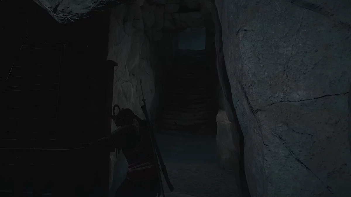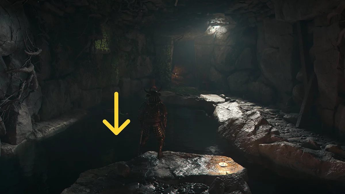 Возле спуска подберите глиняный сосуд с горючей смесью. Спуститесь вниз и используйте его, чтобы расчистить каменную преграду. Продолжайте движение, пока не достигнете зала с противниками. Здесь предстоит сразиться с тремя бойцами и одним тяжеловооружённым воином — обойти их незамеченным не получится. После победы разрушьте бамбуковую перегородку в левой части помещения. Проследуйте прямо, затем сверните вправо и спуститесь до первого ответвления налево, чтобы открыть сундук. Вернувшись, поднимитесь на уступ и проникните в следующую камеру, предварительно обыскав кейс слева.
