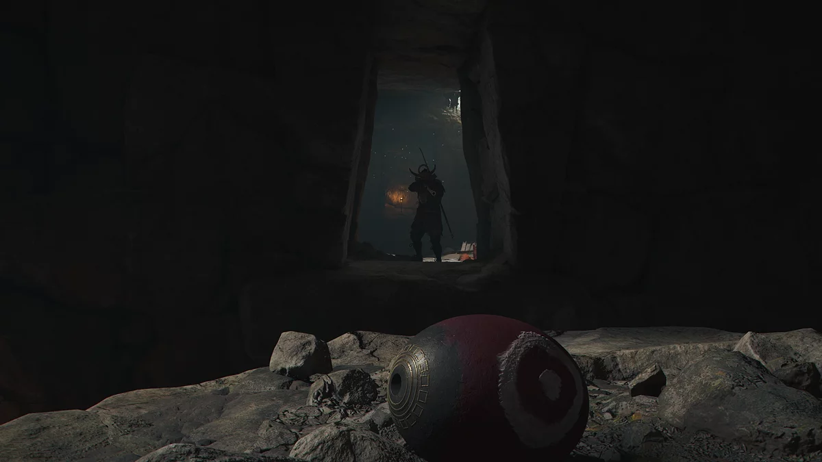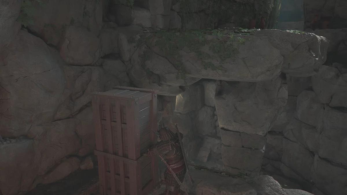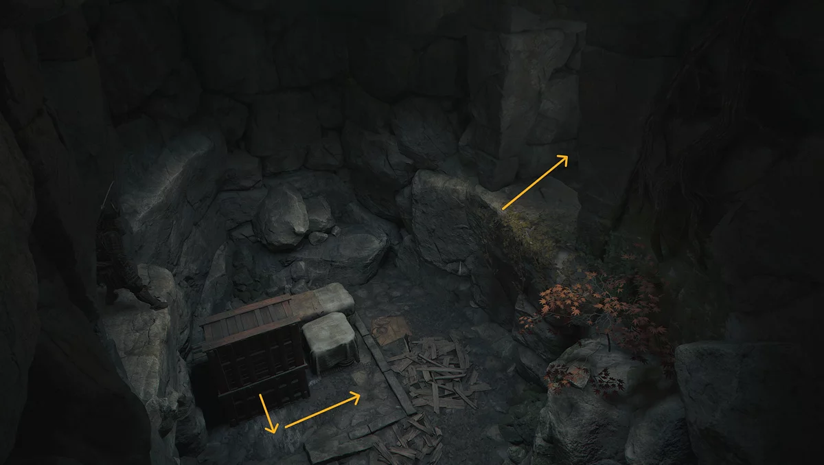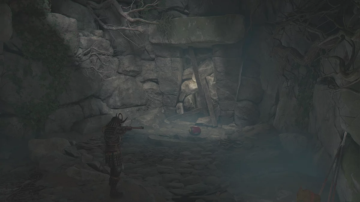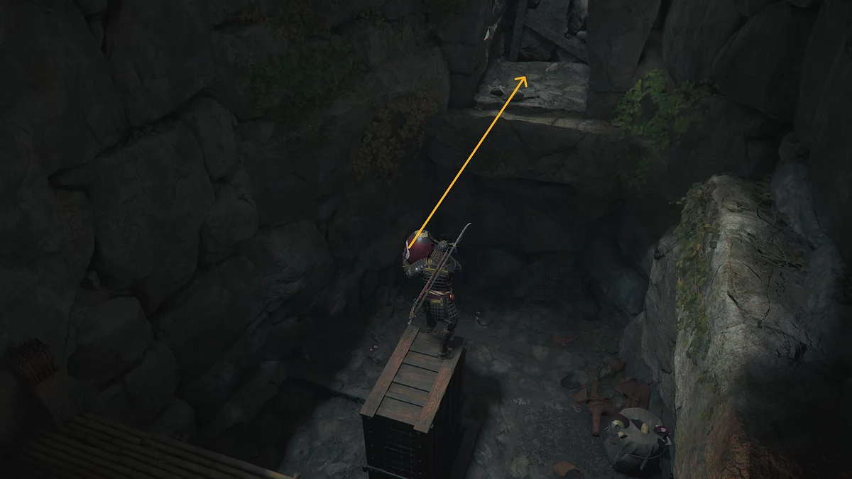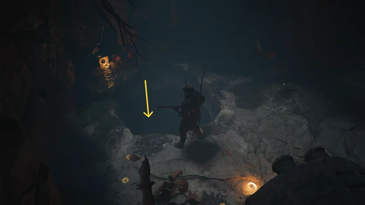 Возле спуска подберите глиняный сосуд с горючей смесью. Спуститесь вниз и используйте его, чтобы расчистить каменную преграду. Продолжайте движение, пока не достигнете зала с противниками. Здесь предстоит сразиться с тремя бойцами и одним тяжеловооружённым воином — обойти их незамеченным не получится. После победы разрушьте бамбуковую перегородку в левой части помещения. Проследуйте прямо, затем сверните вправо и спуститесь до первого ответвления налево, чтобы открыть сундук. Вернувшись, поднимитесь на уступ и проникните в следующую камеру, предварительно обыскав кейс слева.