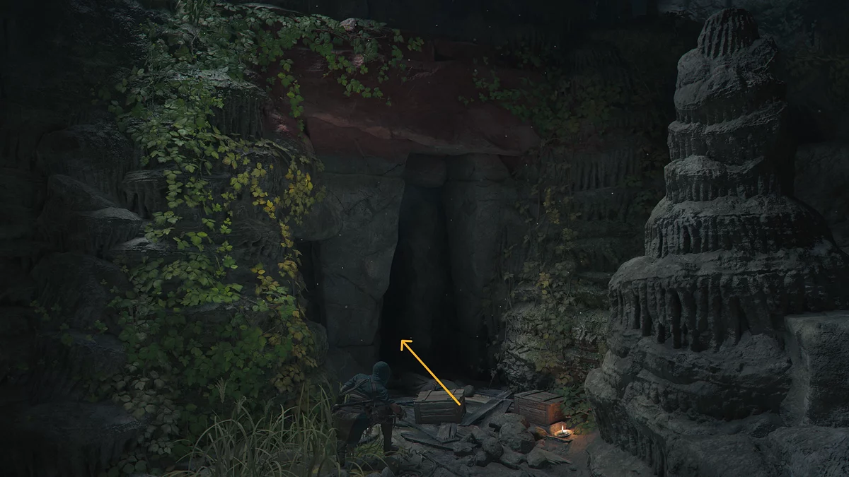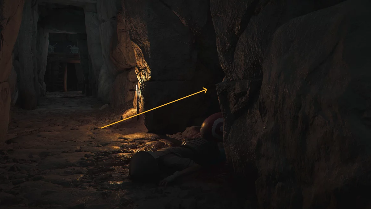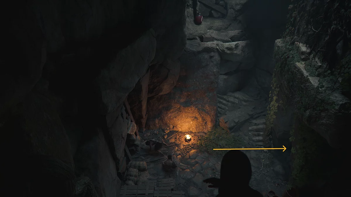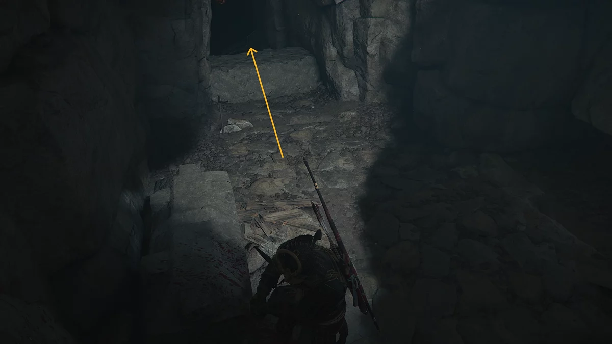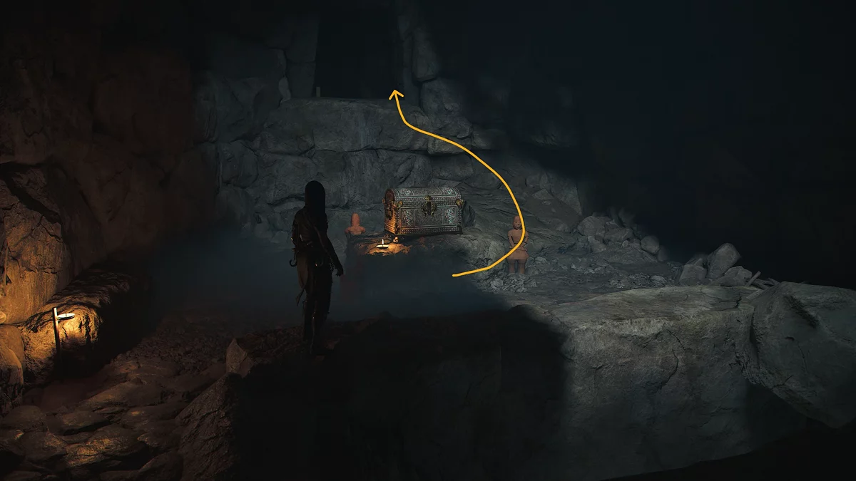 Продолжайте движение вперед, пока не попадете в зал с небольшим сундуком посередине. От сундука идите прямо, так как левый путь — тупик, ведущий к началу гробницы. Далее окажетесь в большом туннеле — поднимайтесь по камням и доскам наверх в правую сторону, пока не достигнете следующего зала с сундуком и развилкой.