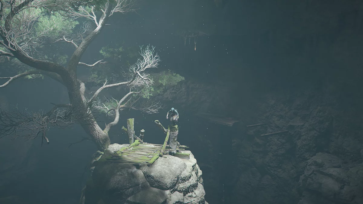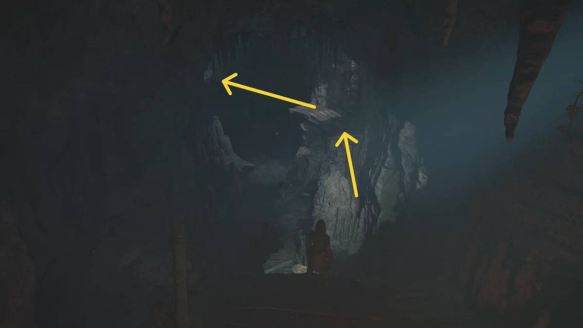 Далее предстоит пройти по длинным коридорам пещеры, используя паркур и крюк-кошку. В конце вы попадёте в большое помещение с деревом по центру. Здесь нужно перемещаться по деревянным платформам, преодолевая большие расстояния с помощью верёвки. Если упадёте вниз и останетесь живы, сможете подняться обратно по деревянному шесту. В этом помещении вдоль стен расположено три кейса.