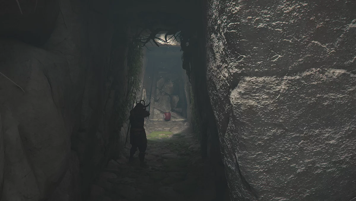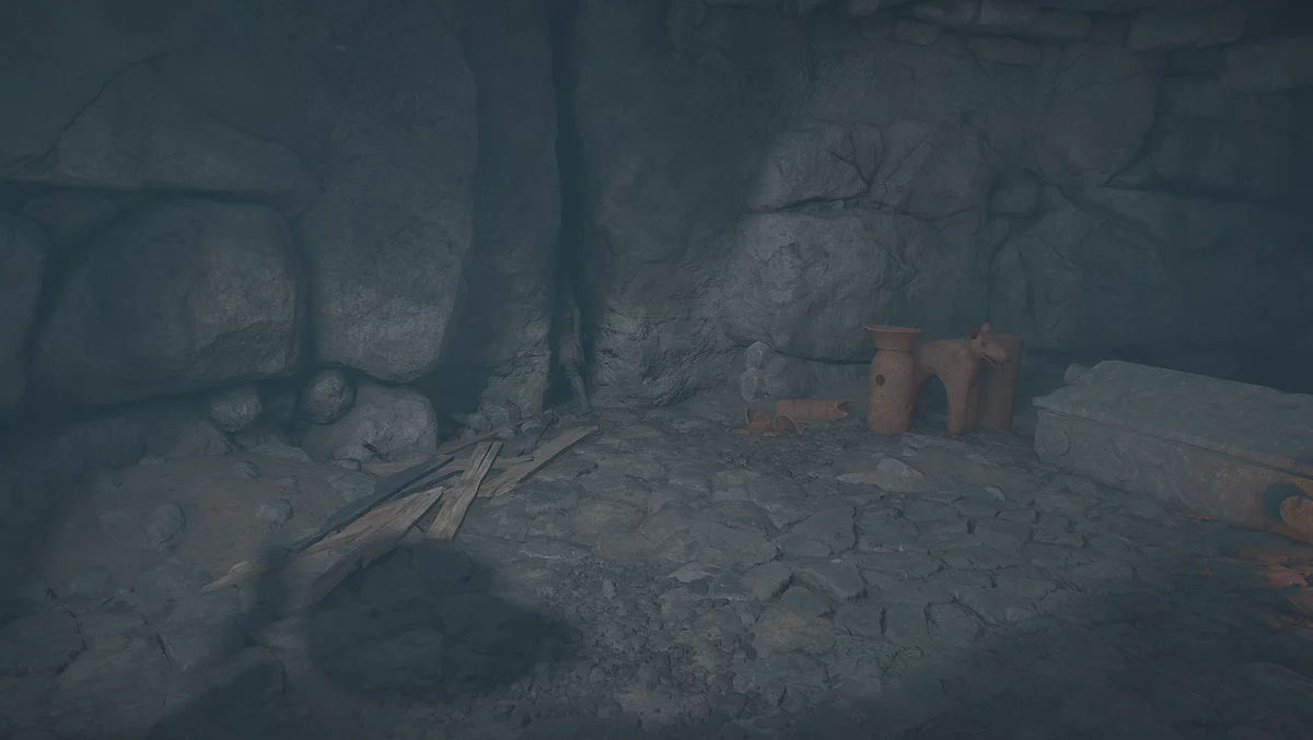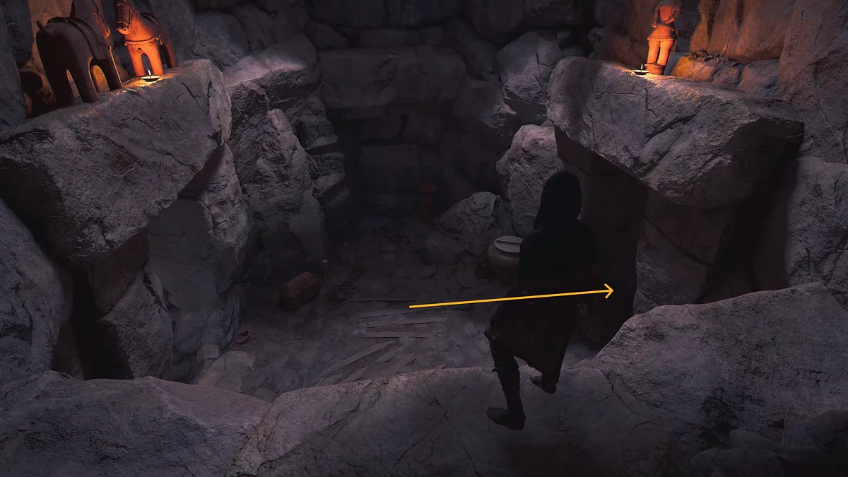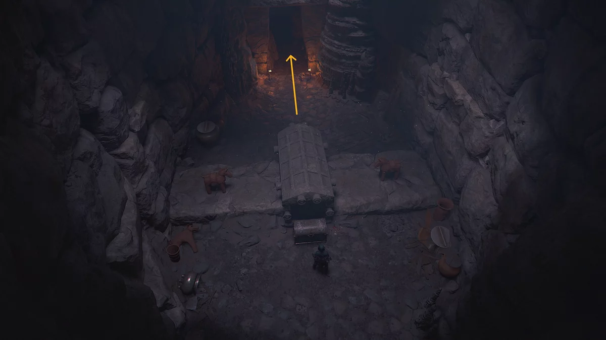 Перед спуском отыщите слева алый керамический сосуд. Возьмите его и спуститесь вниз к каменной преграде, где следует взорвать горшок. Продолжайте движение вниз, обыщите стоящий на пути ларец, затем сверните вправо и отодвиньте деревянный ящик. Продвигайтесь дальше, пока не попадёте в просторный зал с массивным каменным саркофагом по центру.
