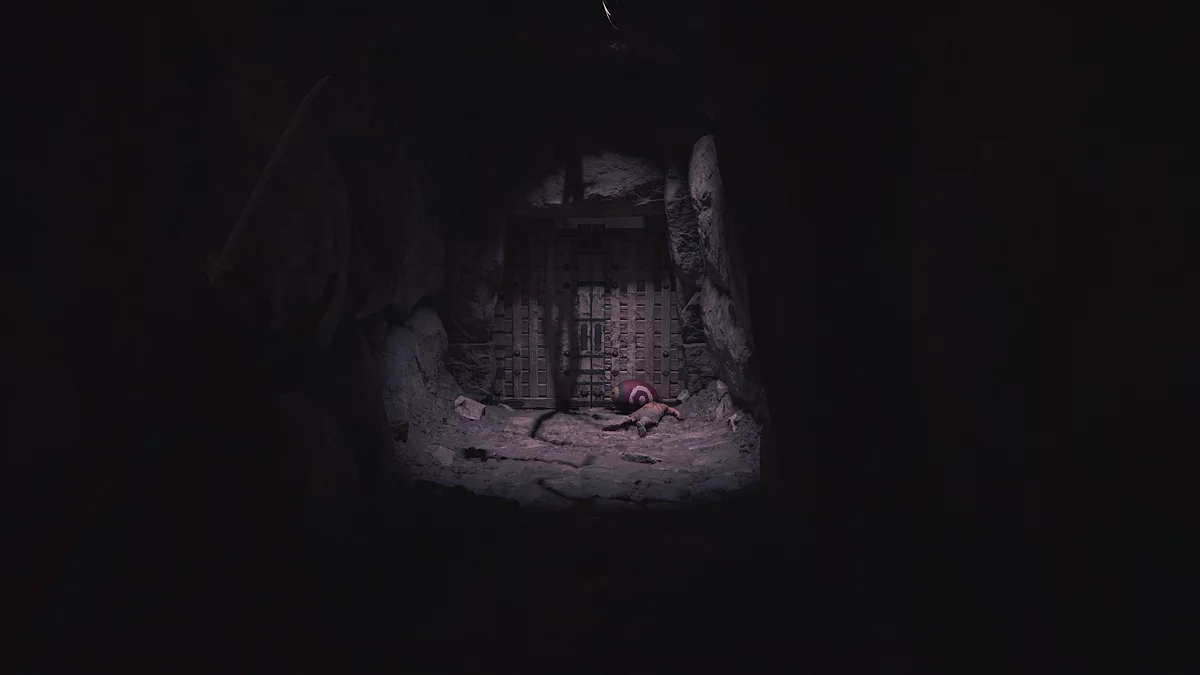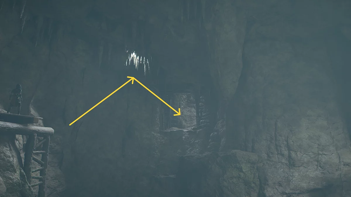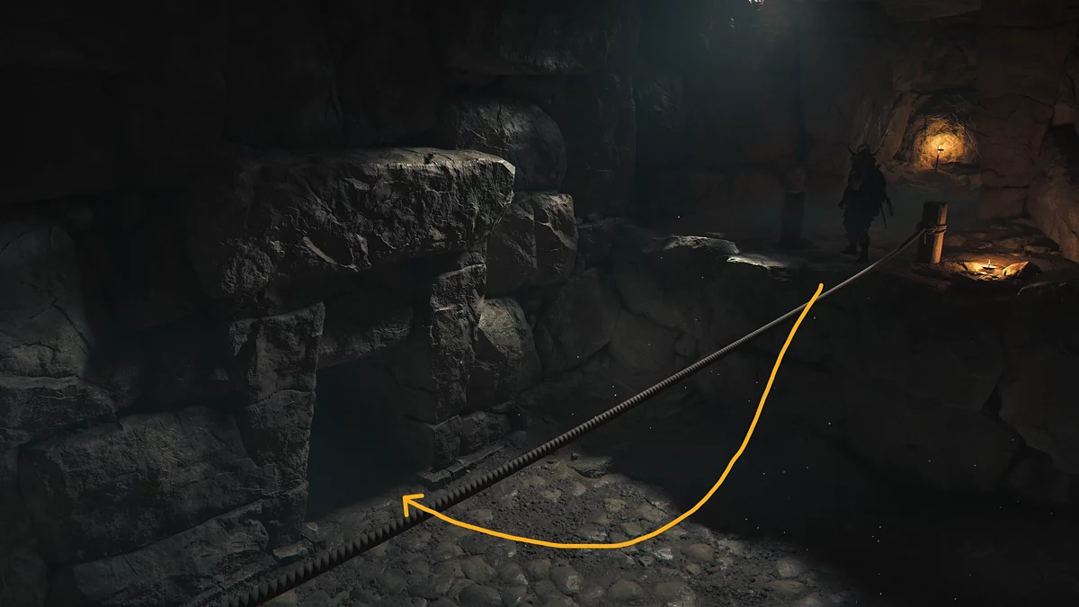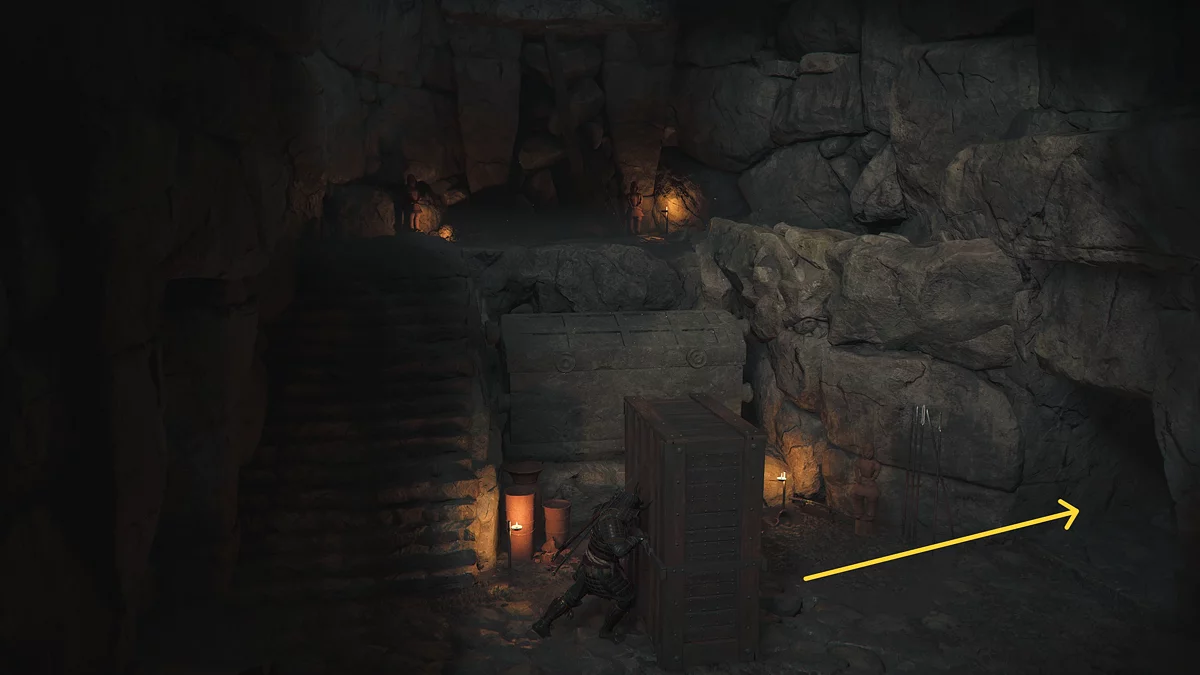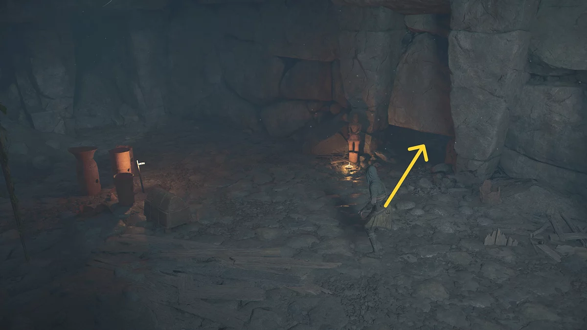 Выбравшись, продвигайтесь по туннелю, используя верёвку и паркур. В более узком участке туннеля обратите внимание на правую сторону — там находится лаз под стеной, ведущий к скрытому сундуку. Вернитесь в основной тоннель и пролезьте через следующую щель.