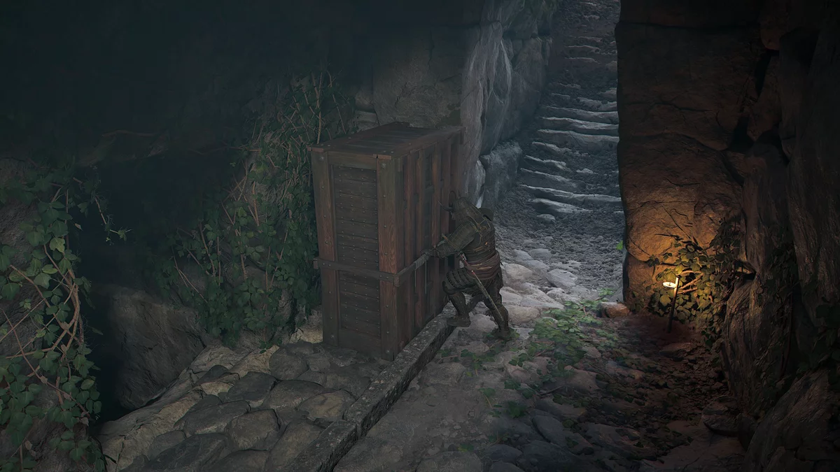 После идите прямо, затем налево, проползите под стеной и поднимитесь вверх. От лестницы сверните влево, чтобы открыть кейс, затем вернитесь и продолжите путь прямо. Так окажетесь в помещении с ящиком и каменным завалом. Передвиньте деревянный контейнер к месту, откуда пришли.