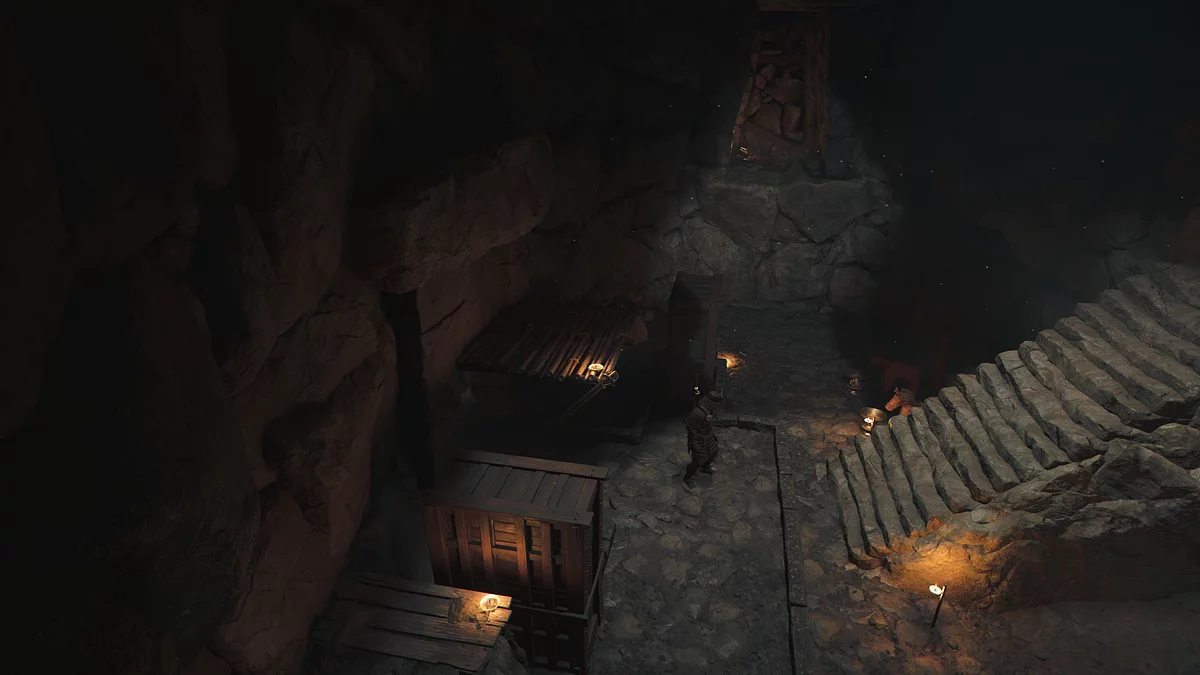 Далее игроки встретят группу бандитов. После их устранения попадёте в зал с ящиками и взрывчаткой. Разместите ящики так, чтобы по ним можно было перенести горшок на противоположную сторону. В следующем помещении сдвиньте ящик в центр зала, метните с него горшок к каменному завалу и расчистите путь.