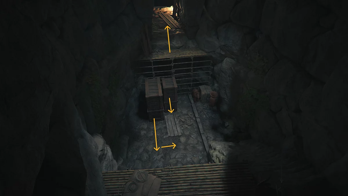 В левой комнате сдвиньте ящик у прохода в сторону, открыв доступ к взрывчатому горшку. Перенесите его на ранее передвинутый контейнер, взберитесь наверх и метните сосуд как можно ближе к каменной преграде, затем взорвите горшок.Продвигаясь дальше по туннелям, вы обнаружите строительные леса и новую группу противников.