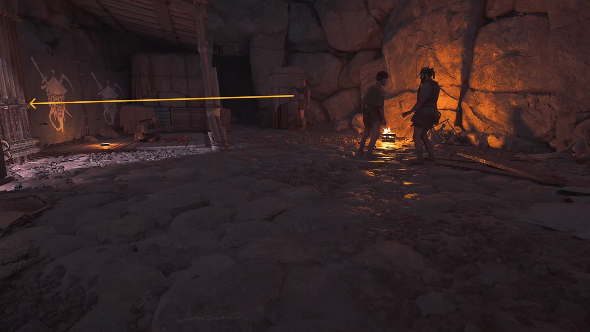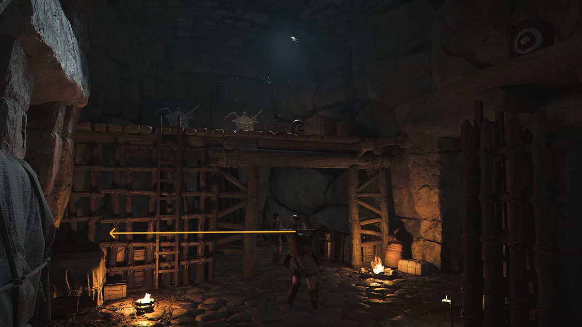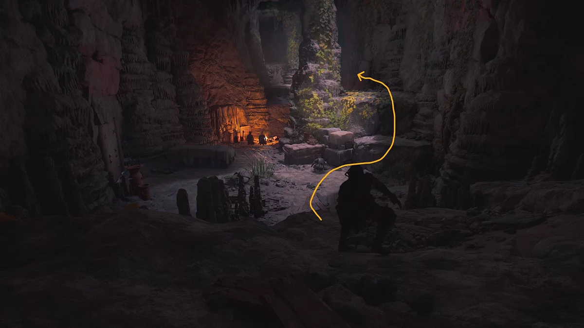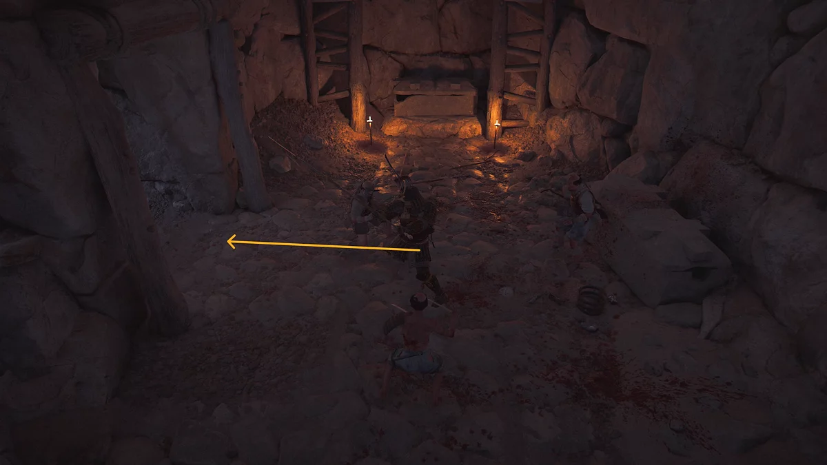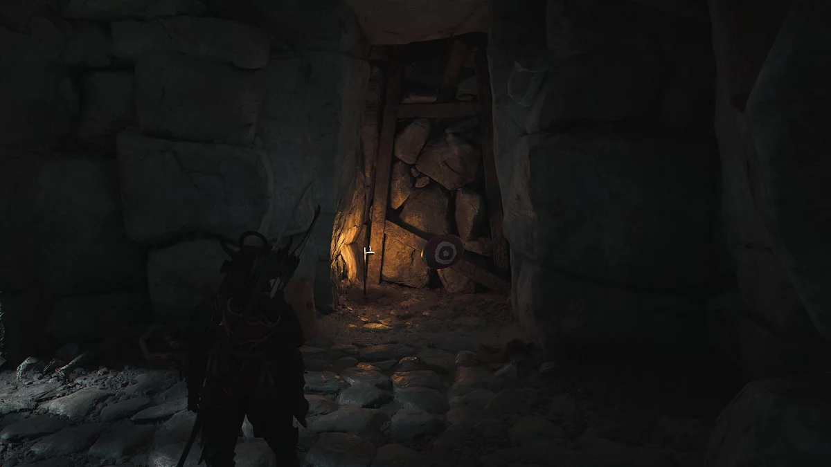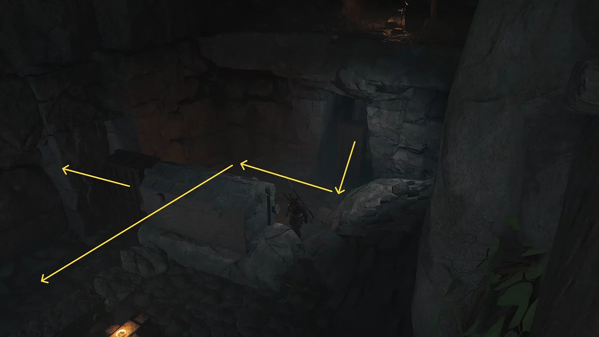 На развилке сверните влево и осмотрите сундук, затем развернитесь и направляйтесь в противоположную сторону по подземному ходу, ведущему к затопленной камере. Преодолейте водную преграду, по пути нырнув за дополнительным трофеем. Выбравшись на сушу, двигайтесь прямо, затем возьмите левее и поднимитесь вверх. Справа будет заметна баррикада из деревянных ящиков — разрушьте её, так как за ней скрывается глиняный сосуд с горючей смесью. Бросьте горшок как можно ближе к каменному завалу и выстрелите в него.