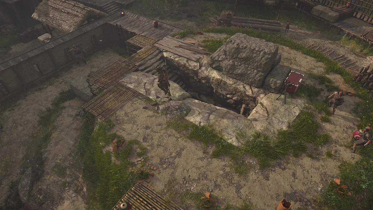Начните исследование, протиснувшись через узкую щель у входа. Спускайтесь, пока не обнаружите группу расхитителей гробниц. С ними можно расправиться, например, взорвать масляный горшок рядом или попытаться пройти незамеченным.