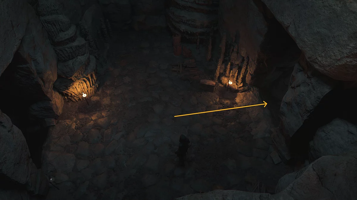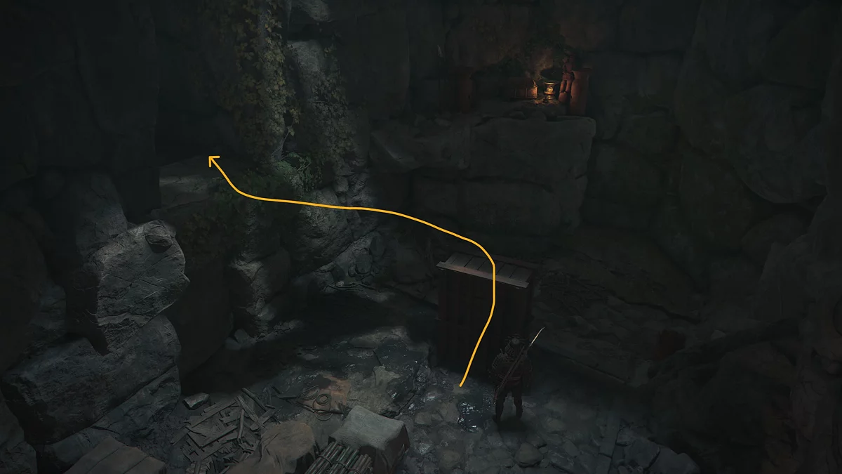 Далее двигайтесь вправо до каменного завала. Обойдите препятствие справа до масляного горшка. Взорвите его, чтобы открыть проход через расщелину.
