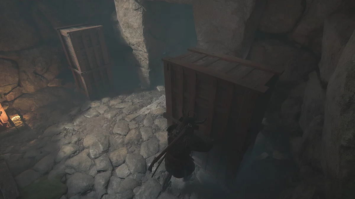 На первом повороте налево проползите вниз, затем следуйте прямо до зала с обрушенным мостом. Спуститесь вниз, сдвиньте деревянный контейнер на себя и влево, чтобы использовать его как ступеньку. Прежде чем подниматься наверх, вернитесь и обыщите сундук, что стоит за ящиком.