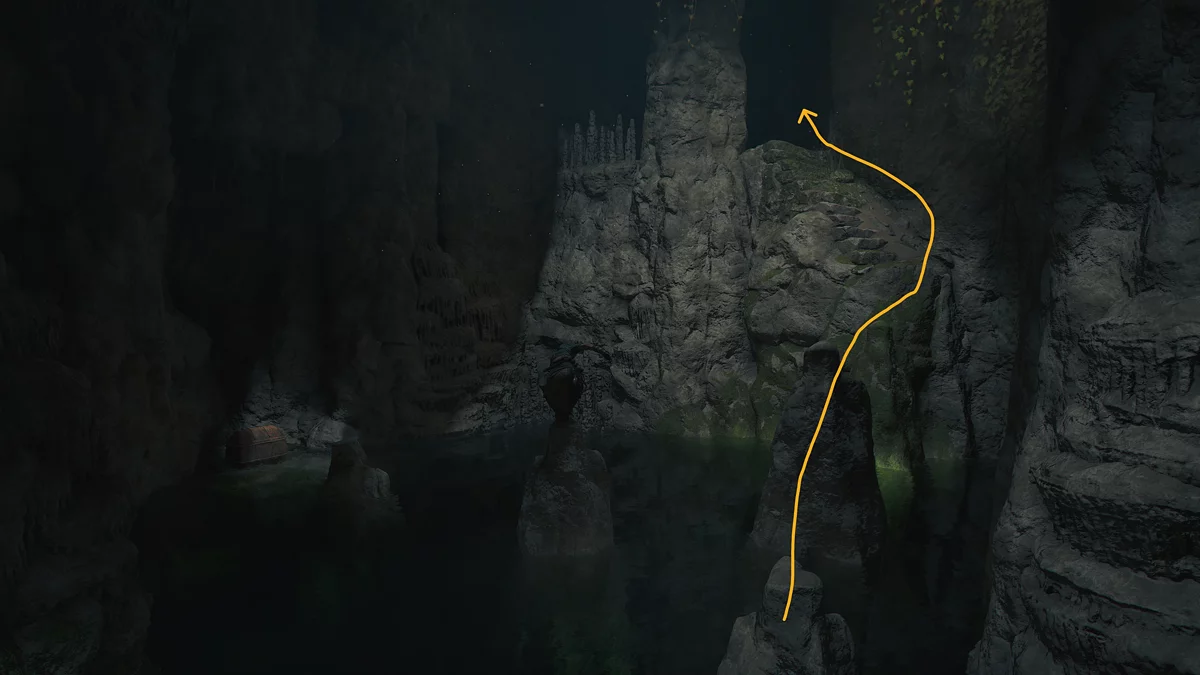 Оказавшись в затопленной пещере, преодолейте её, перепрыгивая по каменным выступам. Двигайтесь прямо, затем вправо вверх, не забыв разграбить сундук по пути. Вскоре достигнете нижнего уровня руин.