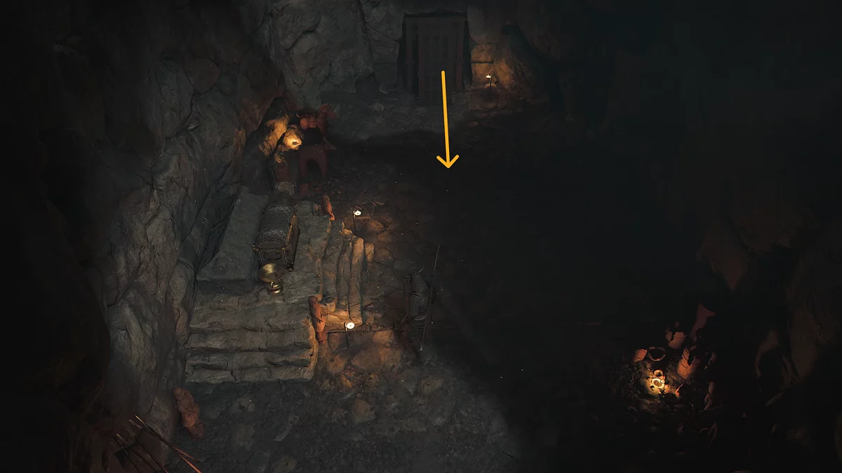 Двигайтесь дальше, поднимаясь наверх, пока не обнаружите проём с ещё одним взрывным горшком. После детонации продолжайте путь — он приведёт вас в зал с легендарным сундуком и последней группой противников.