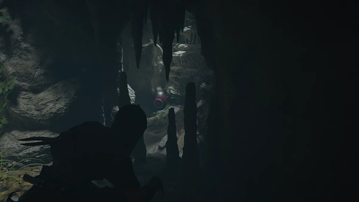 В следующем зале подтолкните ящик немного на себя и немного направо, затем толкните вперёд. Это позволит вам запрыгнуть на уступ с кейсом. Здесь же вы сможете продолжить путь по пещере.