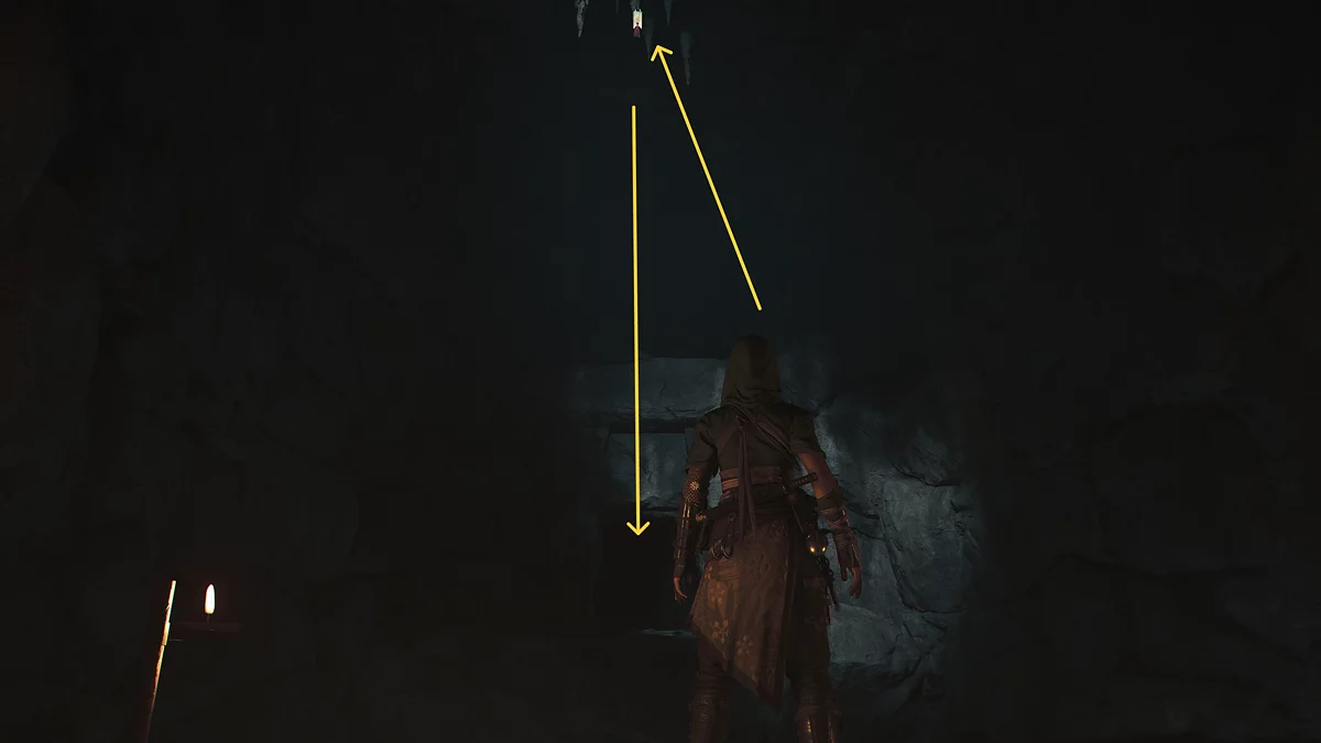 Спуститесь в гробницу, пока не упрётесь в ящик, который нужно сдвинуть вперёд. От ящика поверните налево и выстрелите в масляный горшок, чтобы разрушить каменный завал. Вы окажетесь в помещении с дырой в полу, где нужно спрыгнуть в воду.