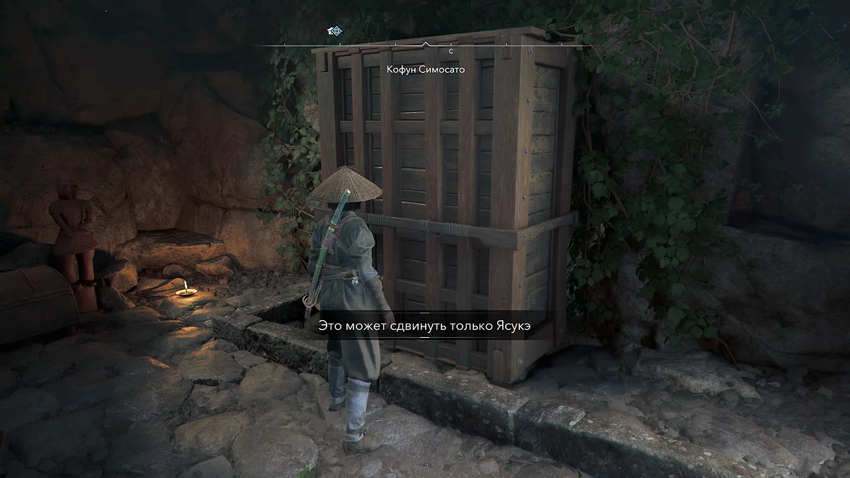 От саркофага поверните налево и следуйте вперёд, пока не наткнётесь на небольшое помещение с двумя ящиками. Отодвиньте большой ящик, чтобы слева от него забрать награду из сундука, а переместив ящик назад, можно попасть обратно в помещение с саркофагом.