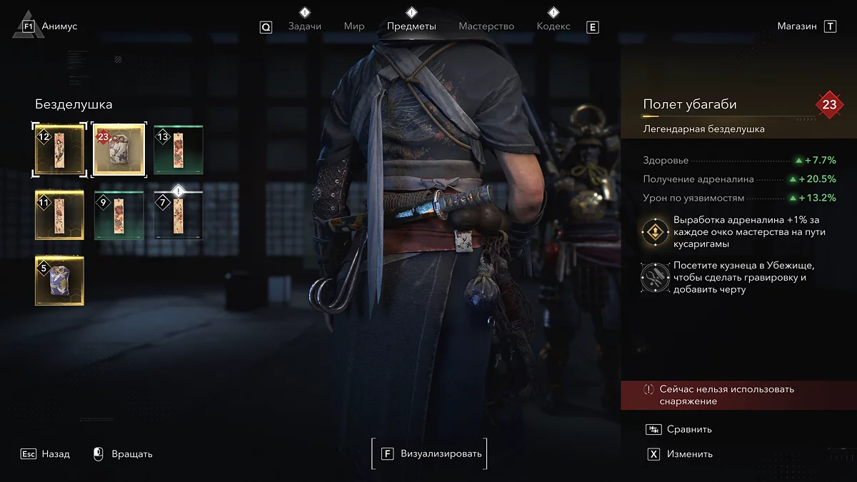- Эффект: Выработка адреналина +1 % за каждое очко мастерства на пути кусаригамы;