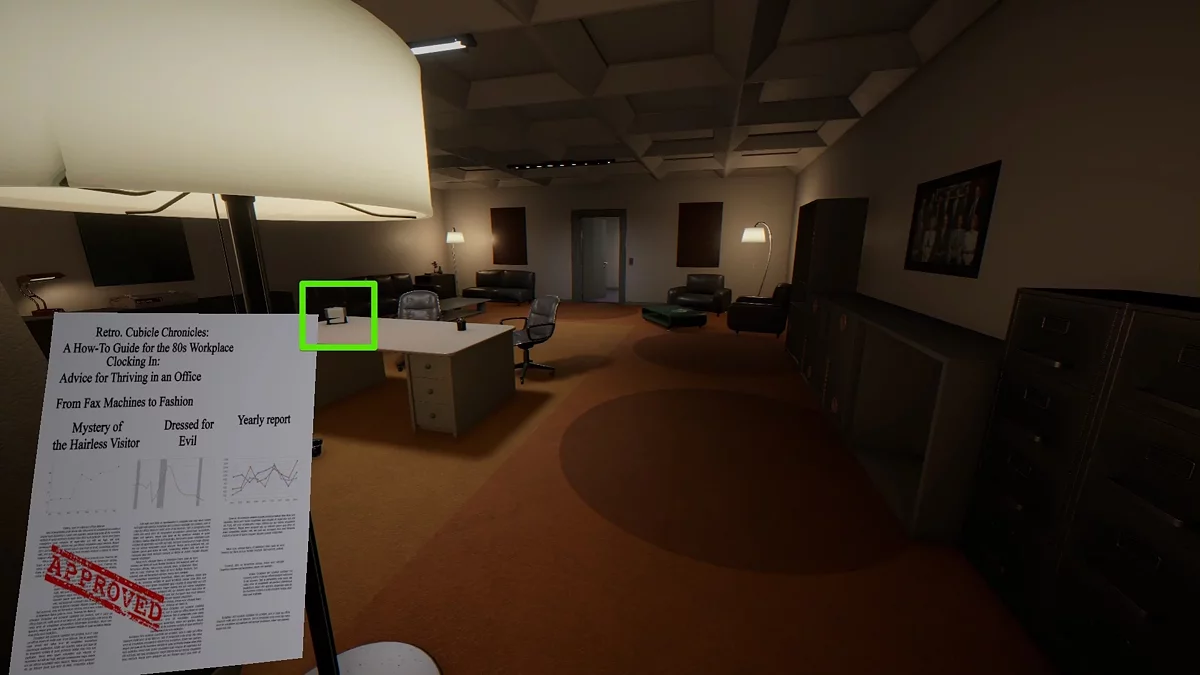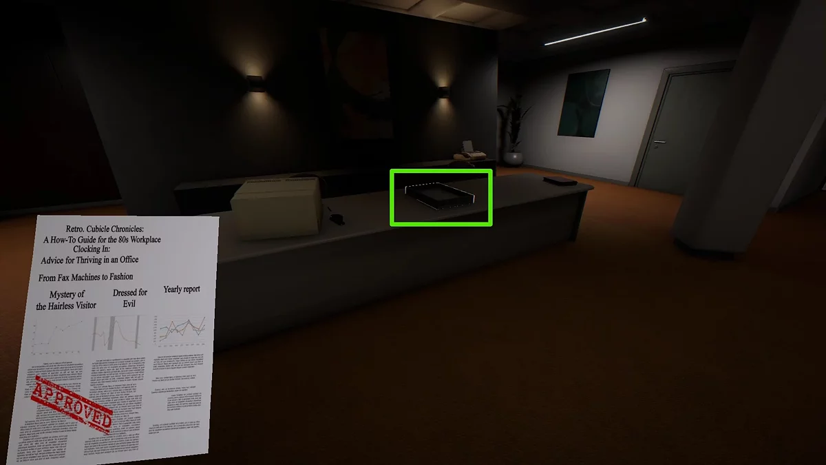 Когда отчёт будет у вас в руках, следуйте в кабинет начальника №701, чтобы подобрать печать на столе. Сразу после этого отправляйтесь на ресепшен и оставьте документ в приёмной напротив лифта.