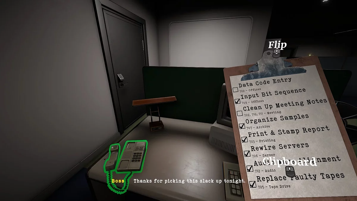 Вам необходимо заменить ленты с красными метками на такие же предметы с зелёными метками. Однако на первый взгляд простое задание может оказаться настоящим челенджем, поскольку, чтобы заменить ленты в офисе №705, их сначала придётся отыскать. Некоторые лежат прямо в нужном вам помещении, другие же могут быть раскиданы по остальным кабинетам. Например, мы не раз находили ленту в архиве.