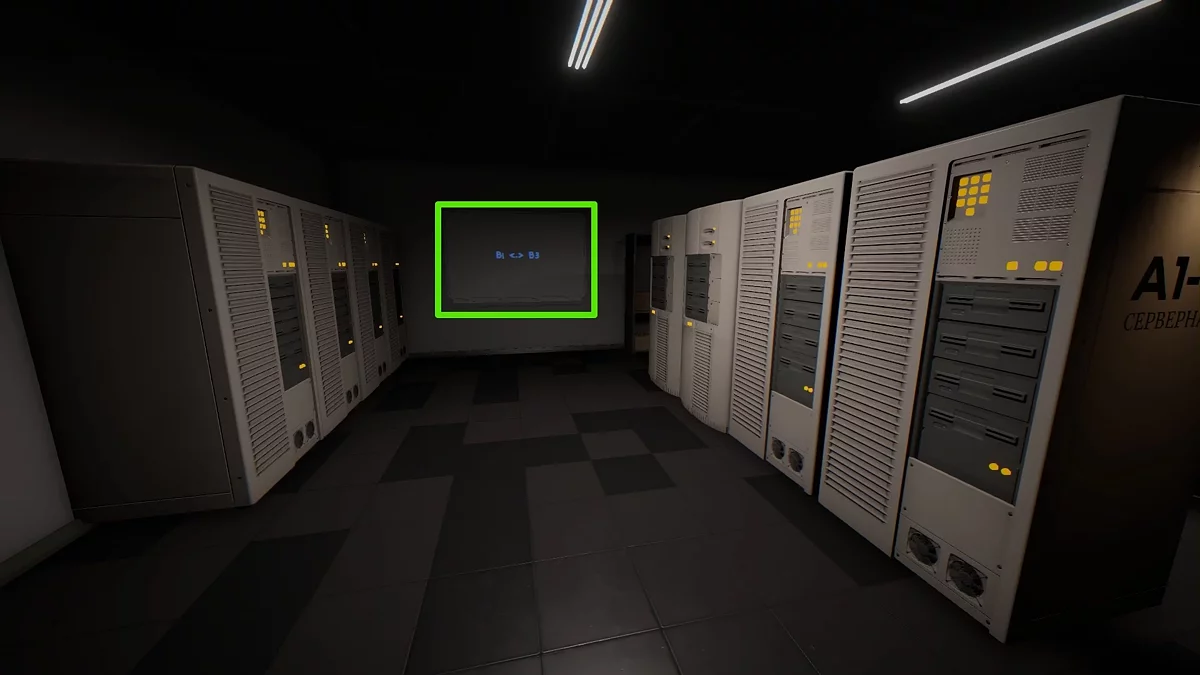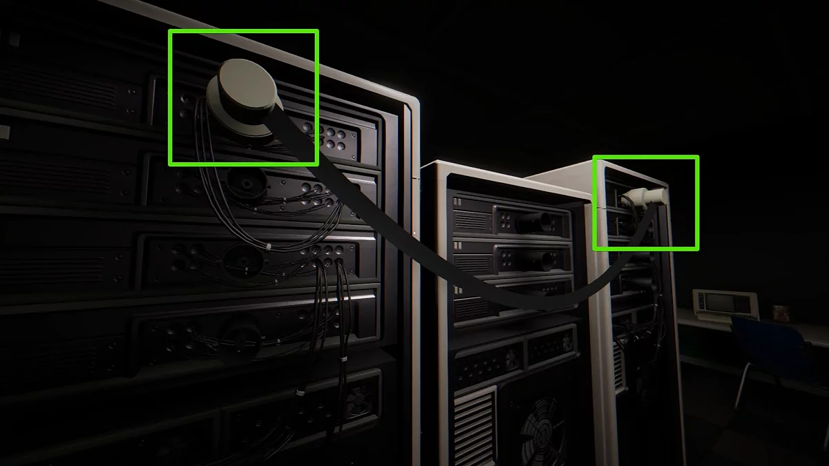 Серверная находится в офисе №706, а правильный порядок действий можно отследить на большой доске в левой части помещения. Здесь вы увидите четыре ряда серверов: нужно подсоединить кабелем один к другому, в зависимости от задания. Например, если на доске указано «D1-C3», воткните кабель в первый блок сервера D, затем тяните его к третьему блоку сервера C.
