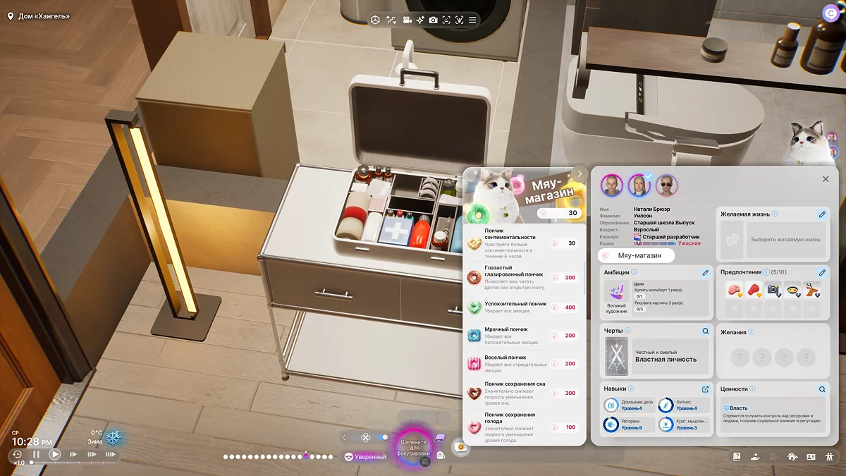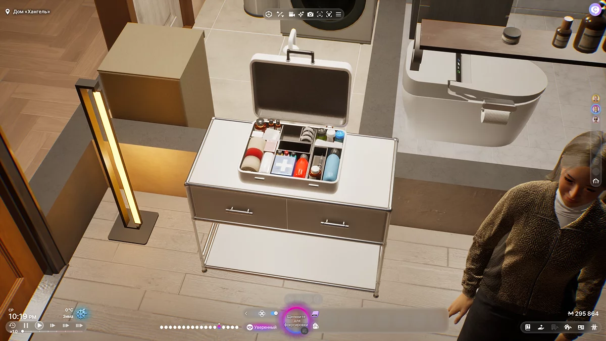 Самый простой метод вернуть подопечному здоровье — воспользоваться аптечкой, которая продаётся в режиме проектирования за 100 M. Чтобы её найти, достаточно ввести в поисковой строке «Аптечка» или открыть любой раздел и в реквизите найти кейс: «Спальня» — «Реквизит» — «Аптечка». После её размещения в доме достаточно подвести заболевшего к аптечке и выбрать опцию «Принять лекарство».