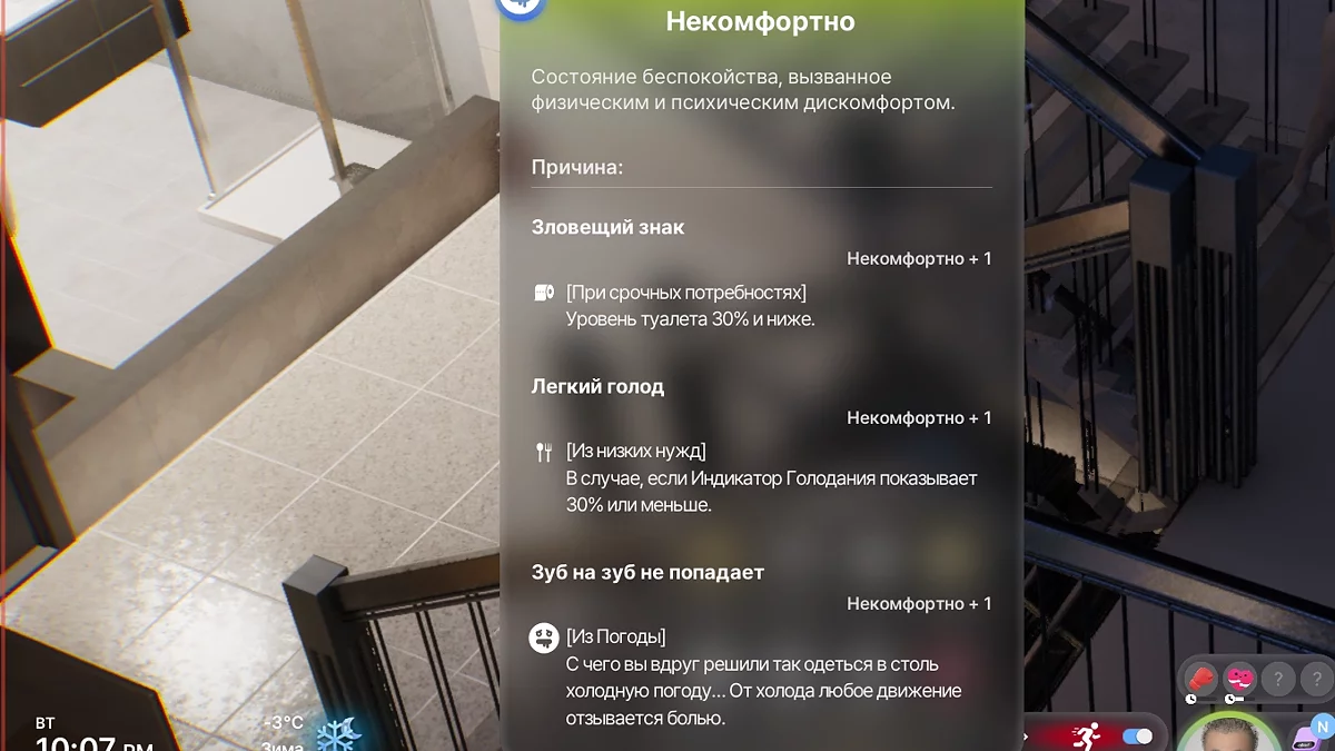 Первые симптомы проявляются не сразу, но внимательный игрок быстро заметит изменения в поведении персонажа. Зои начинает периодически кашлять, чихать или выглядеть подавленным. При наведении курсора на статус «Неудобство» всплывает подсказка, указывающая на простуду или аллергическую реакцию.