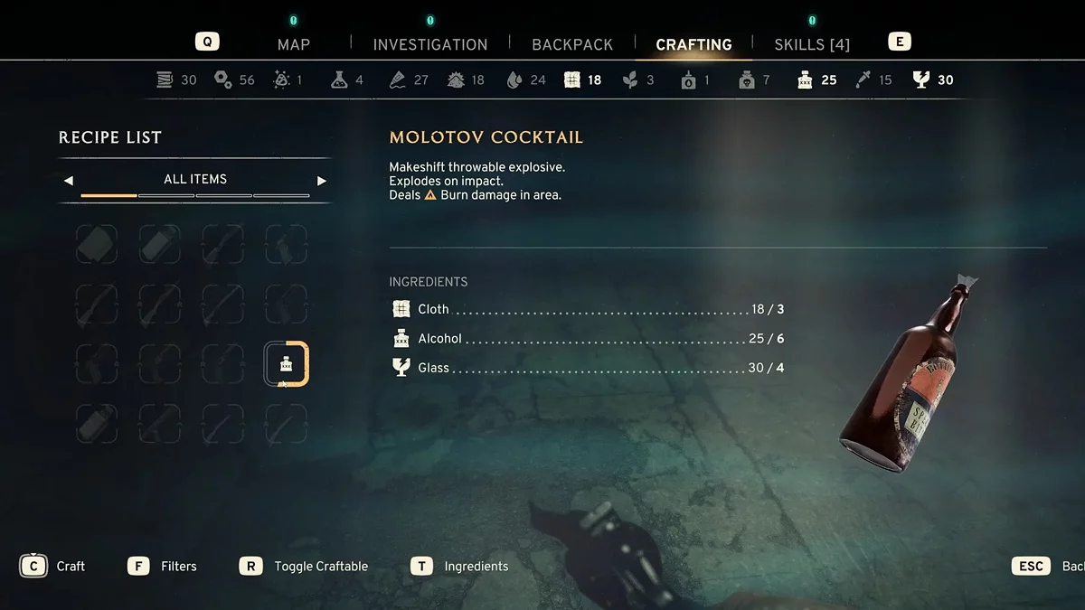 В полевых условиях важно эффективно управлять ресурсами, особенно если у вас есть избыток таких материалов, как алкоголь и ткань. В таких случаях стоит создавать ресурсы, которые вам действительно нужны. Например, бинты пригодятся буквально всегда, ведь главный герой будет часто получать урон. Создание трех бинтов поможет уменьшить запасы алкоголя и ткани, освобождая место для сбора новых ресурсов. Если у вас максимум стекла, вы можете сделать коктейль Молотова, чтобы использовать его. Однако стоит помнить, что подобное метательное оружие требует много алкоголя и ткани, поэтому его создание также поможет сократить их запасы.