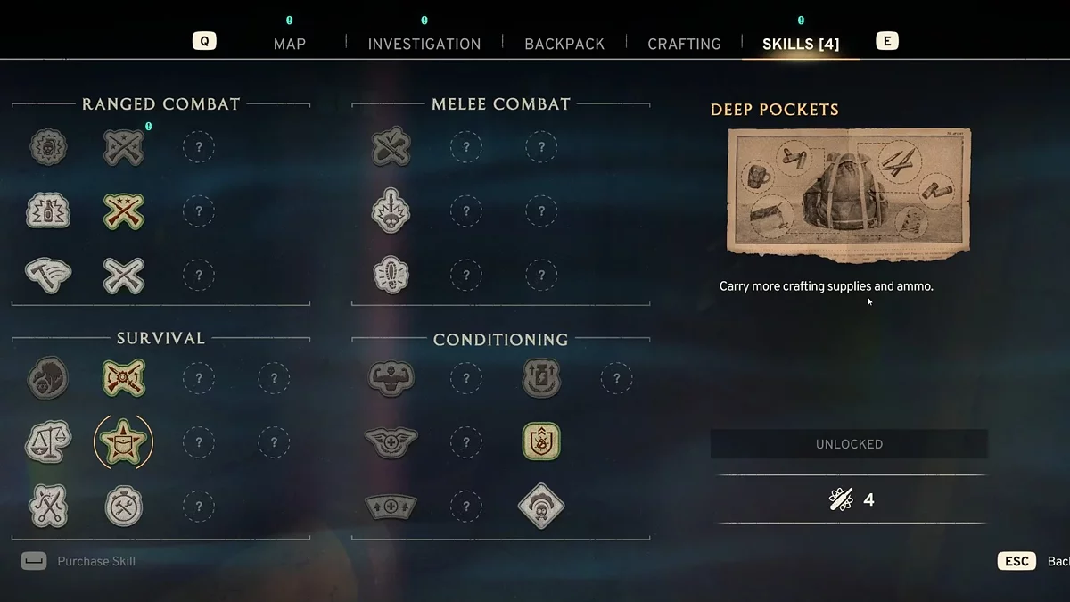 Изучение навыка стоит пять очков, а после его разблокировки вы сможете собирать больше ресурсов для крафта и патронов в свой инвентарь. Мы рекомендуем всем игрокам разблокировать его.