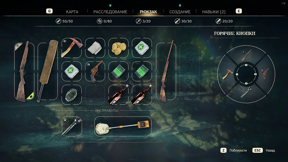 - Специальные инструменты (фонарик, металлоискатель) отображаются в отдельном разделе и не занимают основной инвентарь.