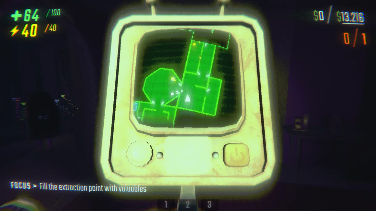 Мелкие найденные предметы будут отображаться жёлтой точкой. Чем больше и дороже предмет — тем больше точка. Тележку можно найти по синей отметке. Если союзник умер, его голова будет отображаться красным. А к текущей точке сбора ведёт пунктирная линия. Карту можно открыть в любой момент, нажав Tab. Это не останавливает вас и не роняет предмет.