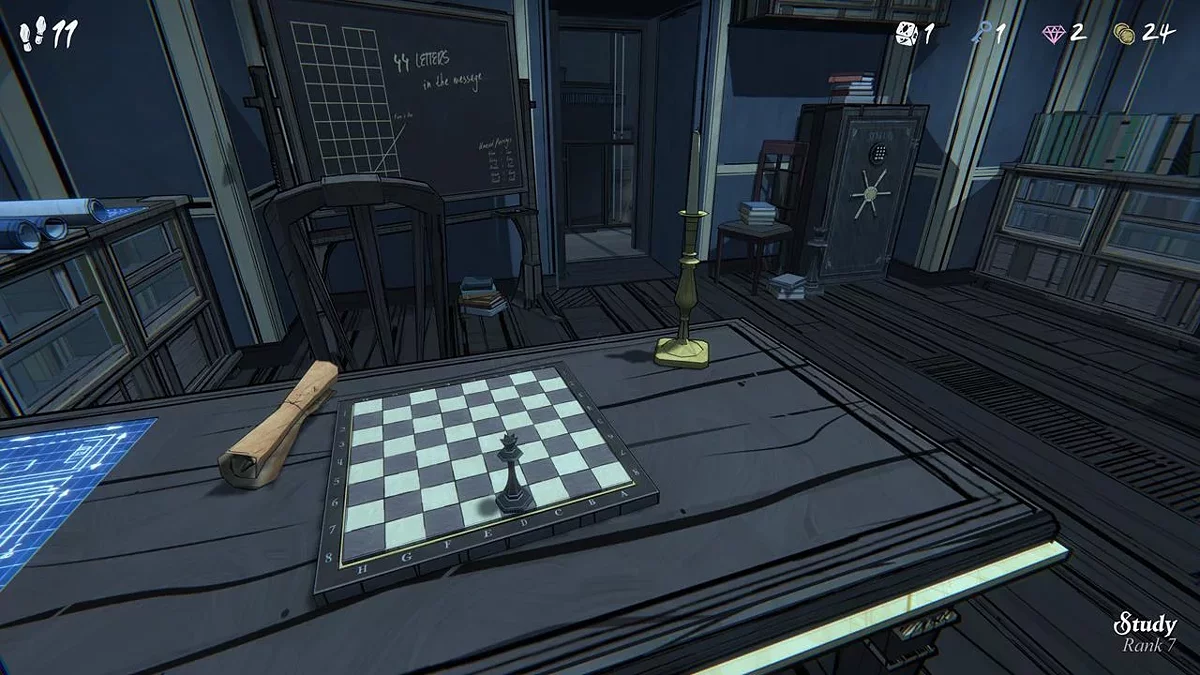 В отличие от предыдущей комнаты, в учебной сейф не спрятан. Однако подсказка здесь такая же неочевидная. Осмотрите шахматную доску — здесь стоит ферзь на D8, что можно интерпретировать как Декабрь 08 (December 08).