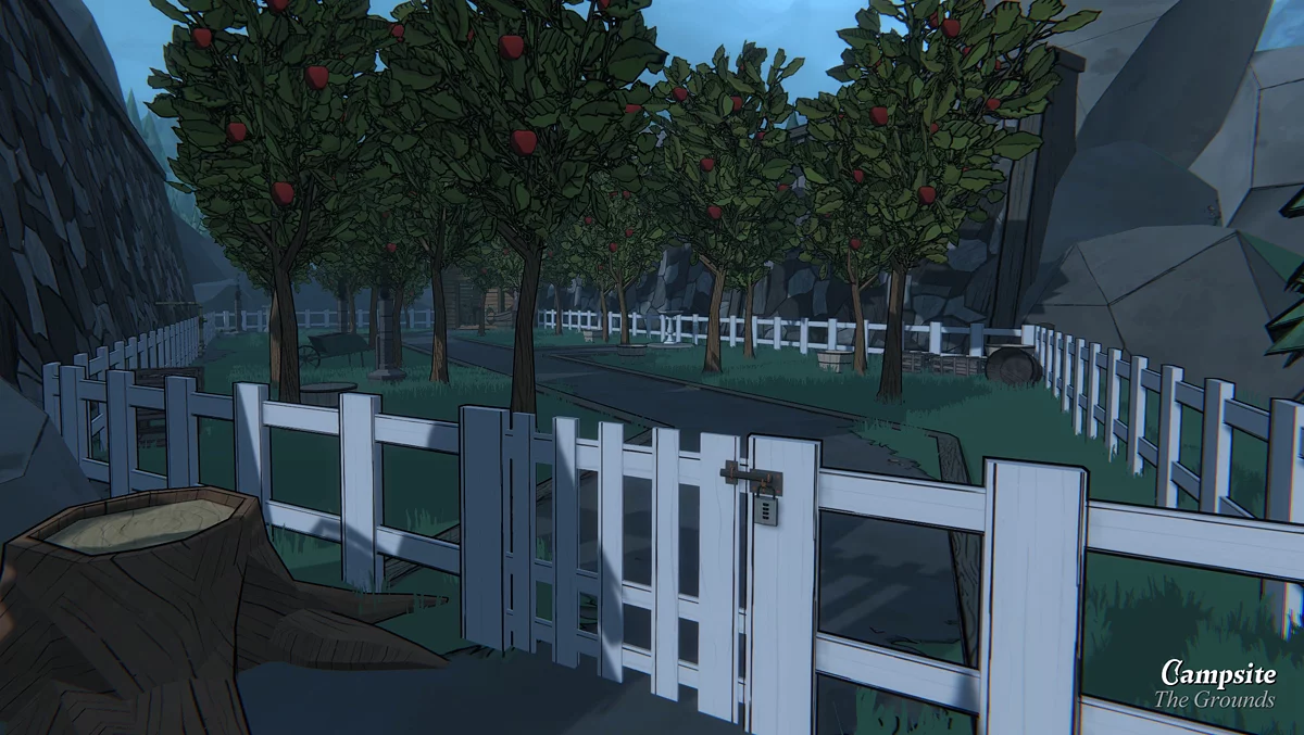 Яблочный сад (Apple Orchard) находится за палаткой героя. Чтобы туда попасть, обойдите шатёр с правой стороны и выйдете на тропинку. Пройдите по ней до калитки и введите код из темной комнаты на навесном замке. Зайдите на территорию сада и с левой стороны откройте газ.