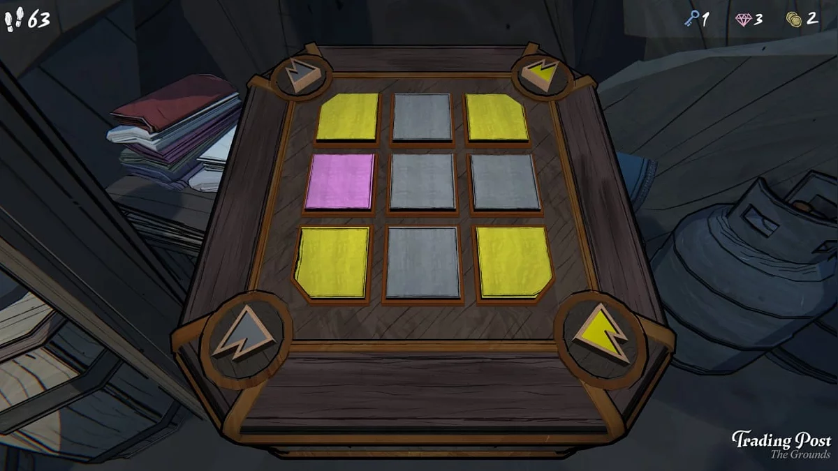 Обменник (Trading Post) — внешняя комната, которую можно бесплатно открыть после разблокировки Западной калитки. В этой загадке символы в углах напоминают горы, которые являются символом Арки Овна, её цвет — жёлтый. Это означает, что вам нужно переместить жёлтые плитки в углы и активировать символы, чтобы открыть коробку.