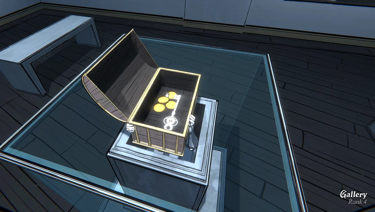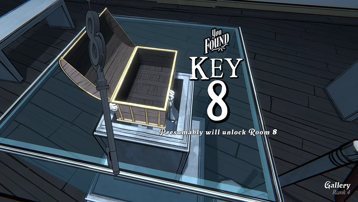 По завершении заполнения всех клеток верными ответами на загадки, сундуки на статуях в центре помещения, распахнутся. В одном из них лежат кристаллы, в другом — монеты и ключ от комнаты номер восемь.