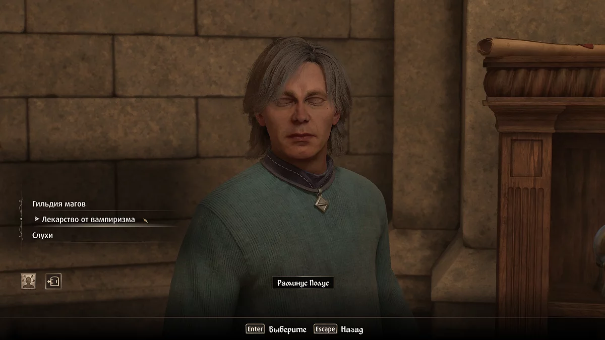 Начать квест можно, поговорив о вампиризме с любым священником в храме или с Винсентом Вальтиери (Vicente Valtieri) в убежище Братства. Найдите Раминуса Полуса (Raminus Polus) в университете волшебников в столице в приёмной архимага и расспросите о болезни.