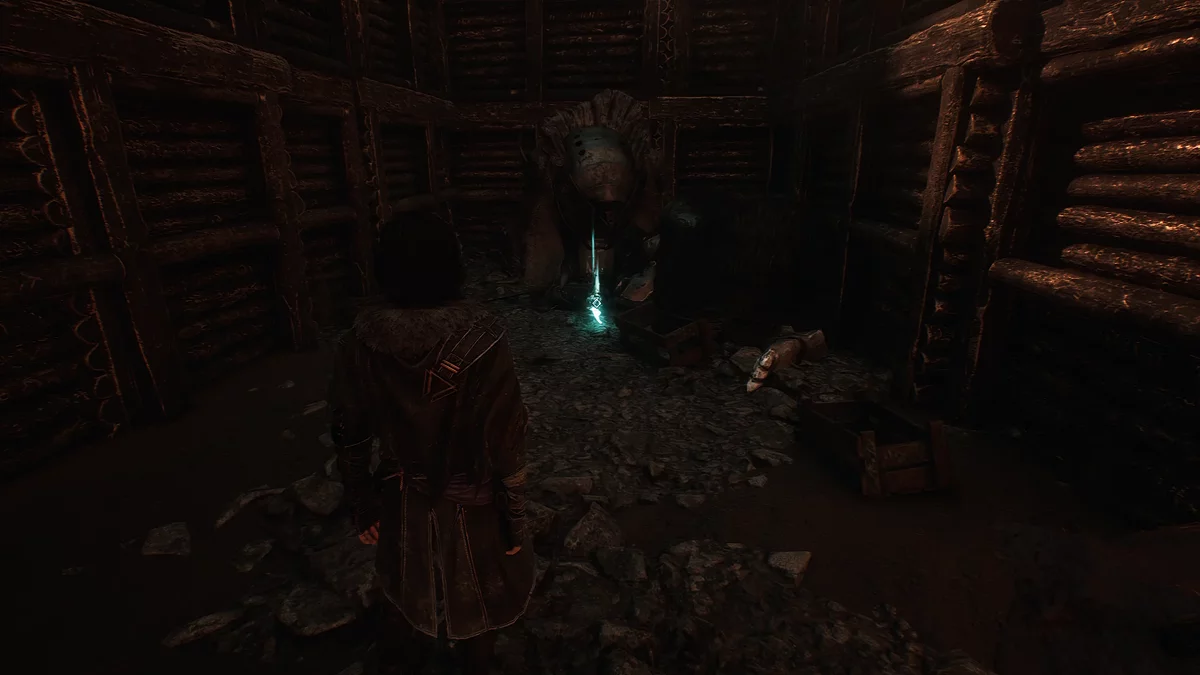Заберитесь обратно на тропу и продолжайте движение вперед. Выйдя из пещеры, от первой лестницы у подъема к Эскье поверните налево и соберите хром. После знакомства с великаном идите направо.
