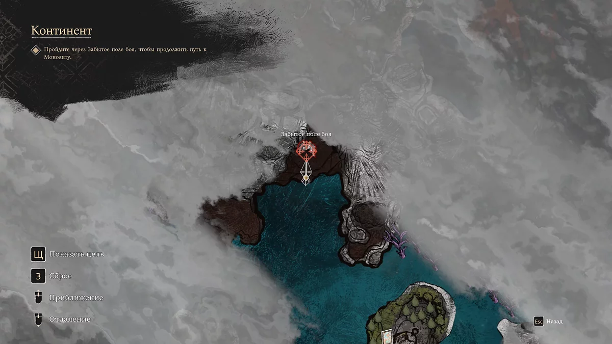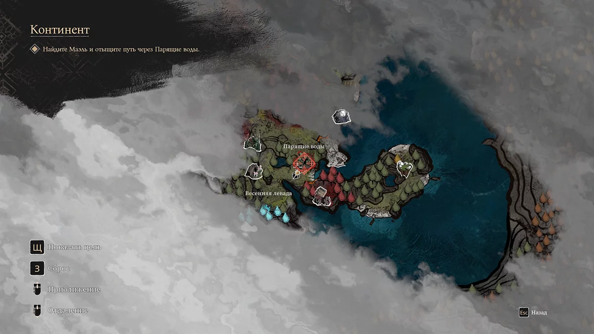 Затем вы окажетесь на карте Континента. Разбейте лагерь, чтобы распределить навыки и отдохнуть. После, используя компас, идите в сторону парящих вод и воспользуйтесь порталом, чтобы попасть в локацию.