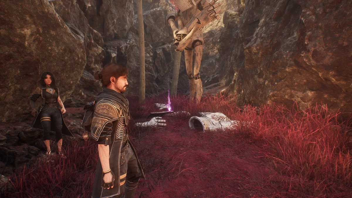 Слева от флага «Вход» соберите хром и идите вперед, пока не встретите каменного монстра. Изучите правую часть скал справа от противника и найдите цвет люмины, а наверху журнал и оружие «Далерам». Слева от гиганта в огромной амфоре спрятан пиктос «Ломающий контрудар»: Урон слома возрастает на 50% при контратаке.